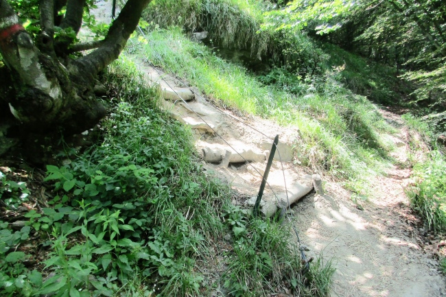 Nach dem Monte Gazzaro führt der Trail tendenziell bergab. Das bedeutet aber nicht, dass es nicht immer wieder knackige Gegenanstiege gibt. Einige Stellen sind recht steil und zum Teil mit Drahtseilen versichert.