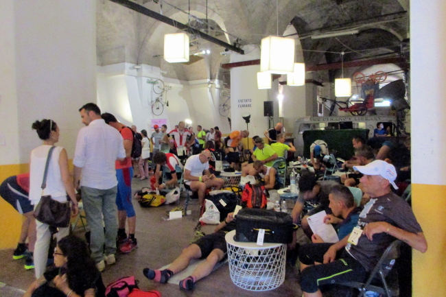Die Startnummernausgabe befindet sich in einem historischen Gewölbe in unmittelbarer Nähe des Bahnhofes von Bologna. Dort geht es am Freitagabend völlig unaufgeregt zu. Die Startnummern gibt es nur nach Kontrolle der Pflichtausrüstung und die ist für einen Lauf im Mittelgebirge ziemlich umfangreich.