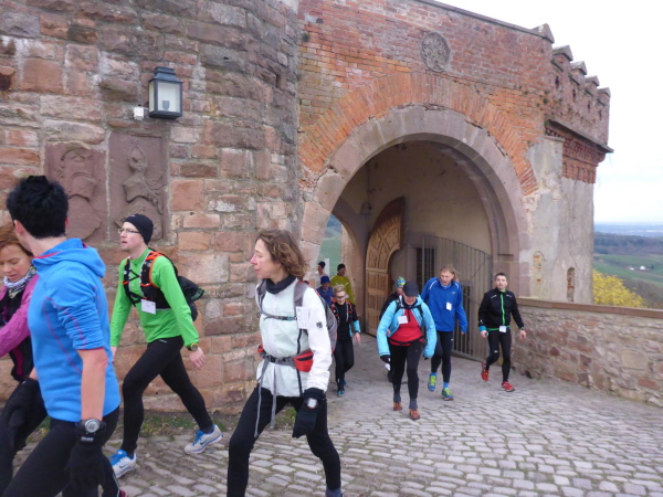 Meisten, aber nicht nur, laufen wir auf gut Wegen. Flach ist es selten, fast immer geht entweder auf- oder abwärts. Mittlerweile ist es hell geworden. In der klaren Luft hat man von oben eine wunderbare Aussicht auf die hügelige Landschaft der Ortenau und ins Elsass. Sogar die Sonne lässt sich blicken. Gut gelaunt kommen wir schnell vorwärts. Wir nähern uns dem weithin sichtbaren Schloss Staufenberg. Dort oben befindet sich die erste VP. Seit 1000 Jahren liegt das Durbacher Schloss auf dem Staufenberg und ist bereits seit Längerem mit seiner romantischen Weinstube ein beliebtes Touristenziel.