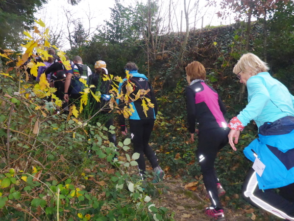 Wie immer nach 20 Kilometern tun mir die Füße weh. Das nächste Teilstück mit immerhin 13 Kilometern Länge wird daher für mich zur Herausforderung. Scheinbar geht es anderen Läufern ähnlich; das tröstet mich etwas. Ich versuche weiterhin vorne dran zu bleiben. Obwohl Brigitte immer zum langsamen Laufen mahnt, kann ich an den Anstiegen kaum folgen. Bergab muss ich nun ganz schön rennen. Ich bin froh, als wir auf den mir bereits bekannten Singeltrail einbiegen, wo am Ende des langen steilen Gefälles Sasbachwalden und damit die nächste Verpflegung auf uns wartet. Die Hälfte ist geschafft.