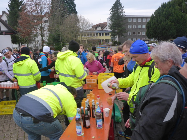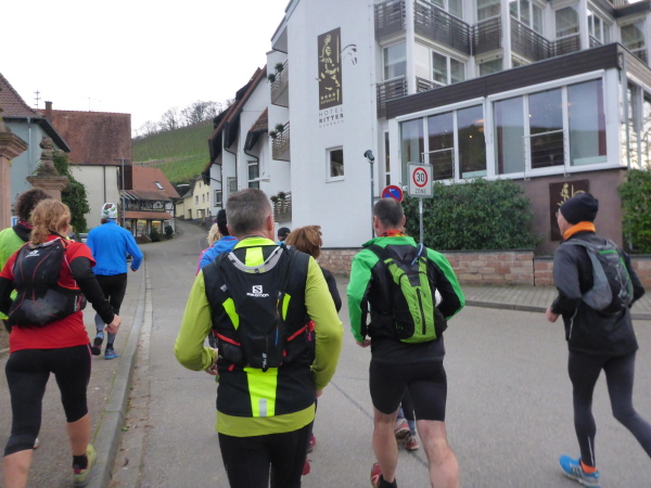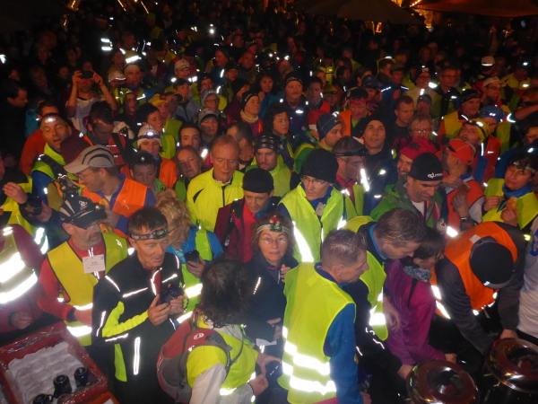Nachdem ich mich ausreichend gestärkt habe, suche ich unseren Kleiderbeutel. Wo ist eigentlich Norbert? Es ist schon recht dunkel und im Meer von gelben und orangefarbenen Warnwesten sind die Personen entsprechend schwer zu erkennen. Er ist noch nicht da: Unsere gemeinsame Tasche ist unberührt. Um in der einbrechenden Dunkelheit sicherer laufen zu können, ziehe ich jetzt meine Trailschuhe an. Jetzt sehe ich Norbert. Er hatte langsamere Läufer begleitet und ist eben erst angekommen. Wir streifen die obligatorischen Warnwesten über; die Stirnlampe nehme ich zunächst nur in die Hand. In diesem Moment wird auch schon zum Aufbruch gemahnt. Wir sind wohl etwas verspätet, denn um 18 Uhr werden wir auf dem Weihnachtsmarkt in Baden-Baden erwartet.