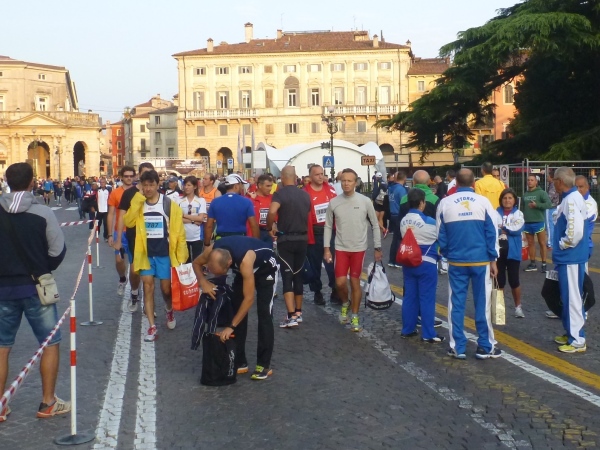 Eine Stunde vor dem großen Ereignis herrscht noch wenig Trubel auf der Piazza Bra. Italienische Sportler haben es nicht eilig. Heute werden 950 Marathonis und 1.450 Halbmarathonis gemeinsam auf die Strecke gehen. Es gibt Startblöcke, deren Zugang auch kontrolliert wird. Zur Gepäckabgabe bringt man seine Sporttaschen mit.