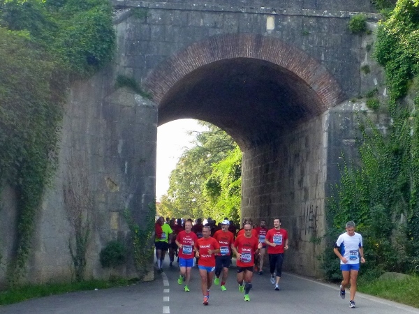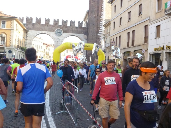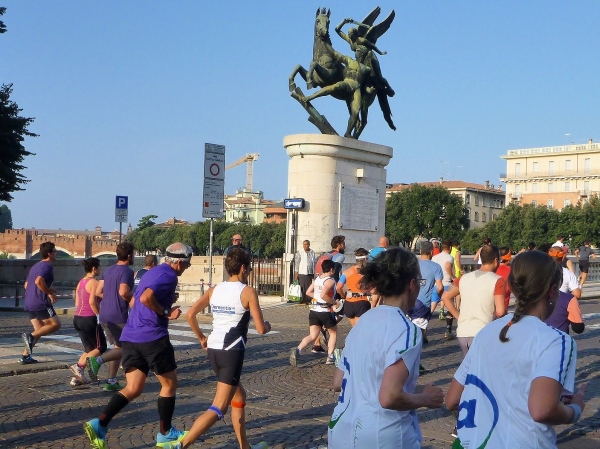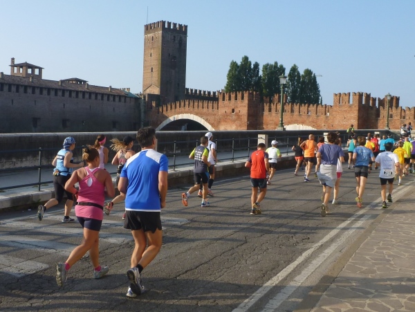 Pünktlich um 9:00 Uhr geht es mit Startschuss, aber ohne italienische Nationalhymne los. Zuerst einmal den Corso Porta Nuova in Richtung des gleichnamigen Stadttors auf und ab. Dahinter liegt der namensgleiche Hauptbahnhof. Nach 2 km sind wir dann schon wieder im Startbereich, haben die ganze Läuferschar vor und hinter uns gesehen und dürfen durch die unscheinbarere Via Roma auf die Festung und Residenz Castelvecchio zulaufen, das wichtigste profane mittelalterliche Bauwerk Veronas. Heute ist in der Burg das städtische Kunstmuseum untergebracht. Unter dem Adelsgeschlecht der Skaliger erlebte Verona eine mittelalterliche Blütezeit. Die beeindruckenden Grabmäler der Fürsten werden wir nach dem Lauf besichtigen. Der Name Cangrande-Halbmarathon wurde im Gedenken an den gleichnamigen Fürsten Cangrande della Scala gewählt.