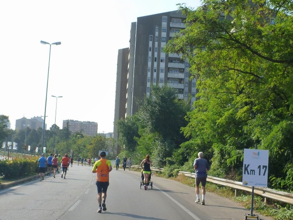 Für die Übernachtung haben wir das Euromotel am Rande der Stadt gewählt. Dort wird das Frühstück etwas früher serviert (außer uns sind noch einige Marathonis am Buffet), sodass wir um 7:30 Uhr den Bus zum Start erwischen. An den Haltestellen steigen diverse Teilnehmer des traditionellen Last-10 km-Laufes oder -Marsches zu. Der ist heute interessanterweise nur 7 km lang und wird nach dem Marathon und Halbmarathon gestartet.