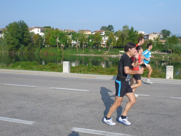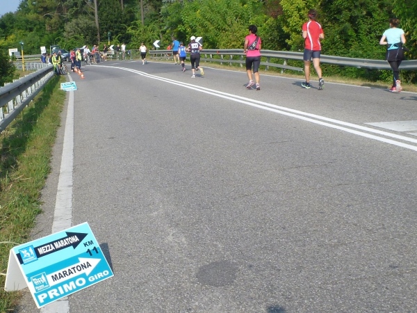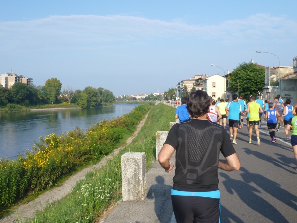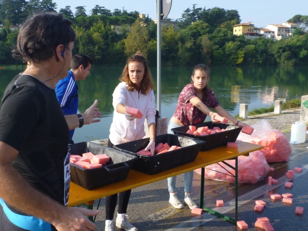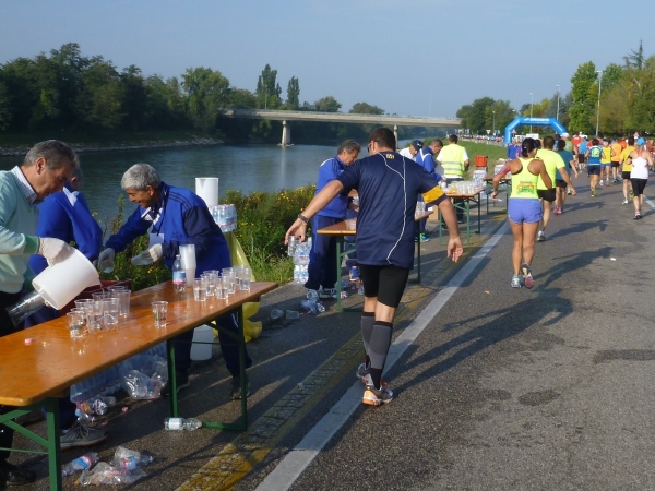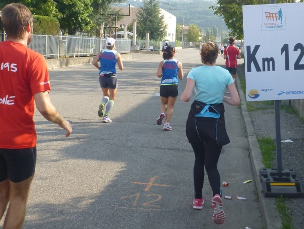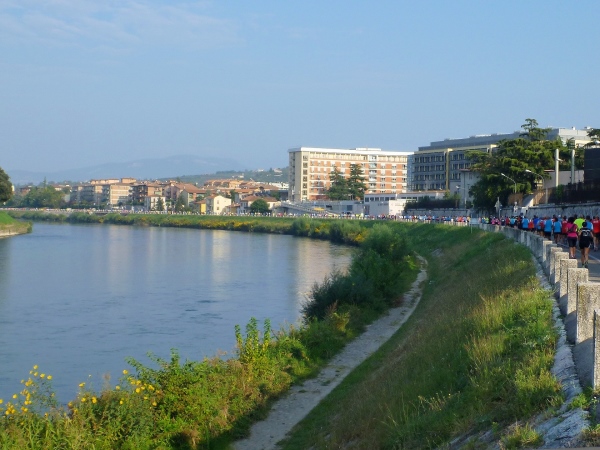 Hinter der nächsten Biegung wird es wirklich italienisch romantisch. Das Städtchen Parona schmiegt sich zwischen Weinberge und Fluss. Umgeben von großen Zypressen liegt die Pfarrkirche am Hang. In der Tageszeitung „L'Arena“ wird man am nächsten Tag lesen, dass die Bewohner sich sehr über den verkehrsfreien Sonntag gefreut haben. Immerhin laufen wir hier auf der Landstraße Richtung Brenner-Pass. Na ja, wo sich da jemand gefreut hat, kann ich nicht sagen, jedenfalls nicht an der Laufstrecke. Und natürlich ist später auch zu lesen, dass ein Anwohner sich über die Absperrung geärgert hat, weil er seine beiden Omas nicht mit dem Auto auf eine Spritztour mitnehmen konnte...