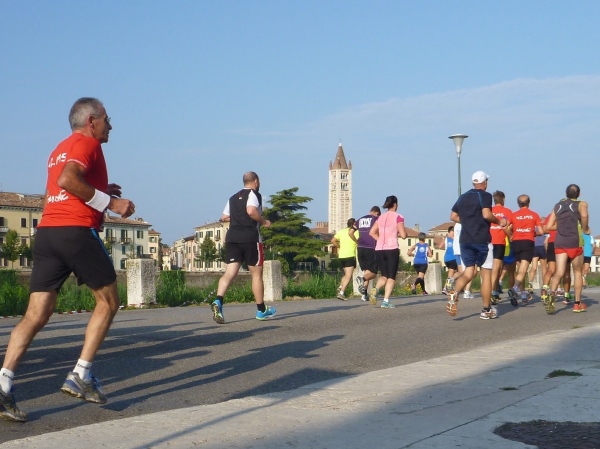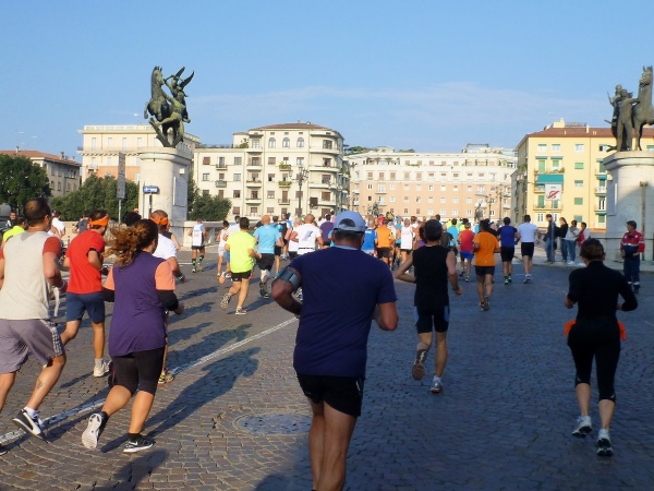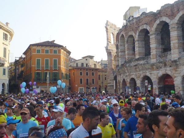 Die Sprecherin gibt die wichtigsten Informationen auch auf Englisch, sodass wir vor sommerlichen Temperaturen über 20 Grad gewarnt sind. Eine Trommelgruppe heizt am kühlen Morgen noch etwas ein. Die Vielzahl ausländischer Starter ist nicht zu übersehen. Verona ist in aller Welt als Ziel für Städtereisen beliebt.