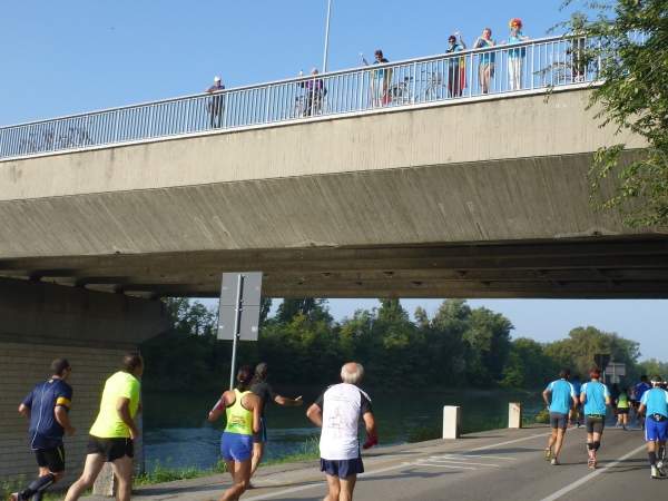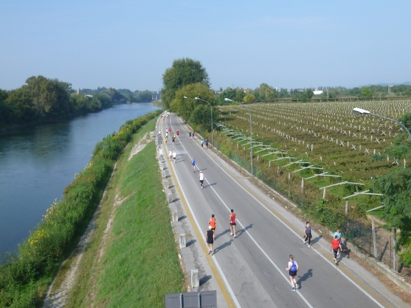 Die Sonne steht noch tief hinter uns, sodass man einen schönen Blick auf das Ponte Diga di Chievo-Wehr hat. Dort stehen einige Zuschauer und dürfen nicht weiter. Das Tor ist verschlossen – wohl wegen uns. Spätestens hier muss ich feststellen, dass man nicht mehr mit allzu viel Zuspruch und Applaus am Wegesrand rechnen kann. Es wird immer mal wieder Zuschauer geben, die aber meist keine besonderen Aktivitäten entfalten. Musikalische Unterstützung sucht man auch vergebens.