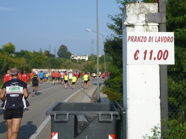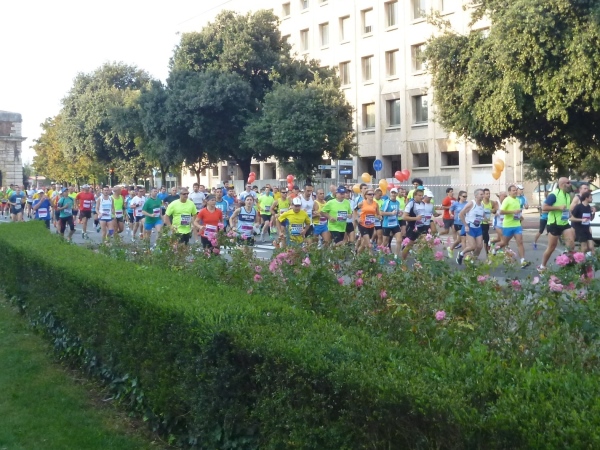 Schon öfter habe ich bei italienischen Laufveranstaltungen rote Hemden mit der Aufschrift „Simone 42,159“ gesehen. Simone ist heute selbst dabei. Er wird in seinem Spezialfahrzeug von seinem Team begleitet und freut sich sehr über den schönen Tag. Leider habe ich vor Ort die Chance vertan, etwas mehr über Simone und seine Freunde zu erfahren. Das Internet ist da nicht ergiebig. Ich werde das bei meinem nächsten Lauf in Italien nachholen.