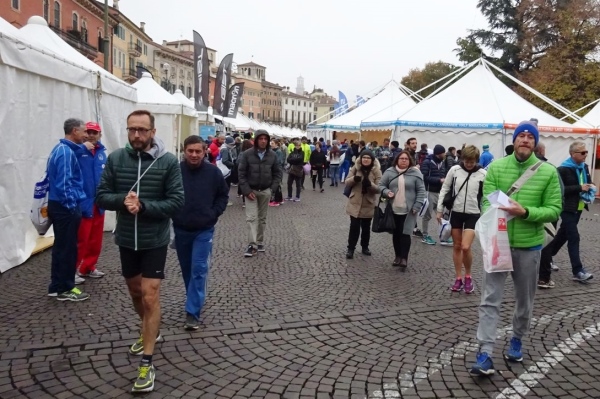 Vom Hotel Nuova Rossi nahe dem Bahnhof bis zur Expo auf der Piazza Bra direkt neben der Arena sind es ca. 1 ½ Kilometer. Man merkt, wie kurz Ende November die Tage werden, die Dämmerung bricht herein, als ich gegen 16 Uhr die Startunterlagen in einem anlassbedingt aufgebauten Zelt abhole. Entgegen sonstiger Gepflogenheiten bei anderen Marathons in Italien ist der Kleiderbeutel hier fast leer – Warenproben gibt es keine, nicht einmal eine Wasserflasche, geschweige denn ein Gelpäckchen. Dafür bekommt jeder Läufer (damit sind auch alle weiblichen Starter gemeint) ein Kurzarmfunktionshirt. Der Leihchip wird von TDS bereitgestellt und ist mit einer Klammer auf der Startnummer hinten befestigt.