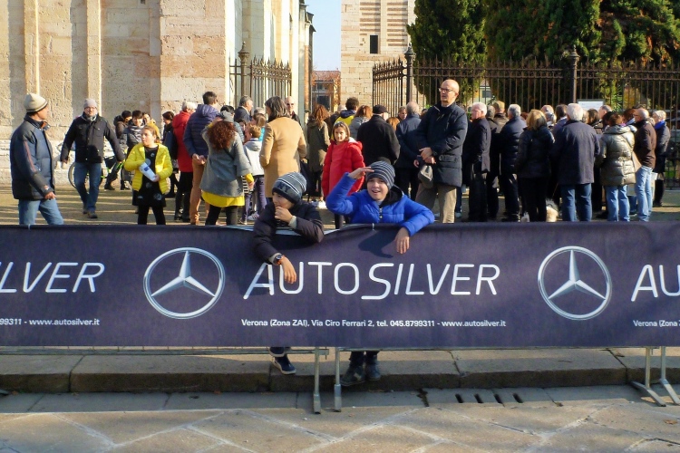 Für uns steht eine Vier-Kilometer-Runde durch das Viertel San Zeno an. Über die neu gestaltete Piazza Corrubaio durch ein Gässchen auf die kleine Chiesa di San Brocolo zu und dahinter eines der Highlights von Verona, die Basilica San Zeno Maggiore. Eine Touristengruppe lauscht den Erklärungen ihres Reiseleiters. Ich rufe mal rüber. Dann kurz umdrehen und ein Erinnerungsbild der Kirche schießen, samt Verkaufsstand des Sponsors Mercedes-Benz.