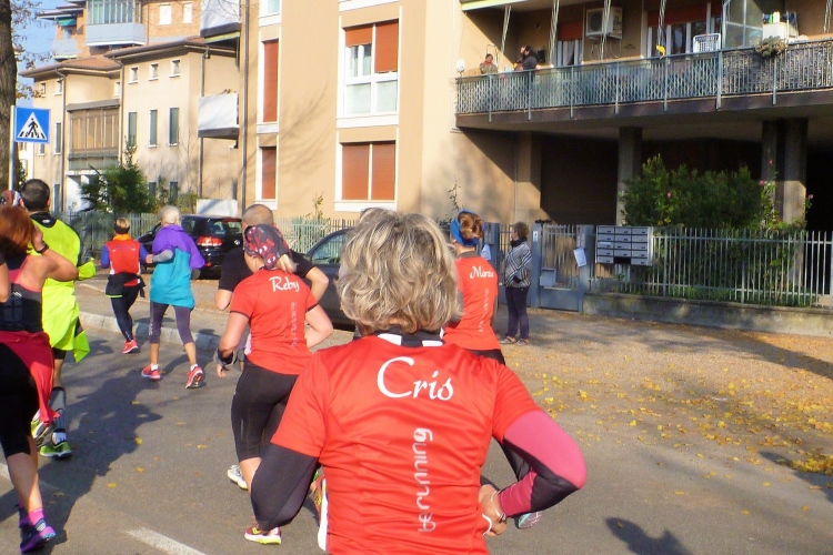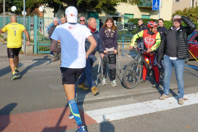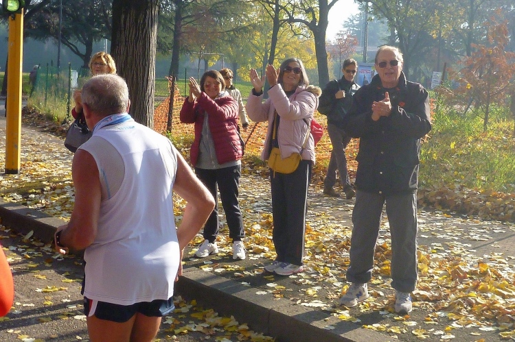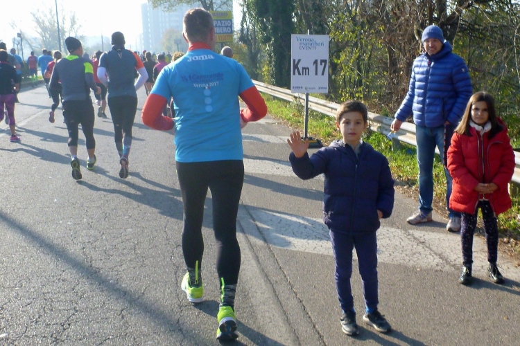 Das Städtchen Parona wirkt verschlafen und gar nicht touristisch. Beim Anblick des netten Hotels Brennero fühle ich mich in die 1950er Jahre versetzt. Parona ist fest in der Hand der Läufer. Wenige Meter entfernt werden wir auf der Parallelstraße zurücklaufen. Auf der Viale del Brennero geht es weiter nach Norden unter der Eisenbahn hindurch. Zuschauer gibt es einige, die es aber beim stummen Betrachten der Szenerie belassen. Immerhin sind viele Kinder zum Abklatschen an den Streckenrand gekommen. Eine Mutti zählt brav mit.