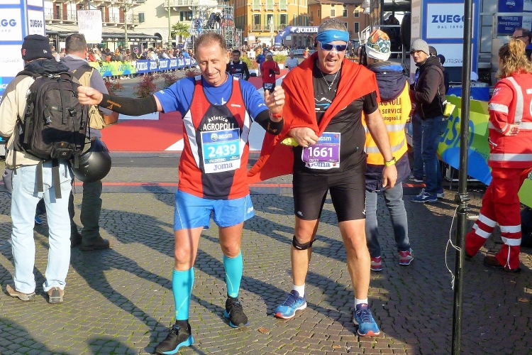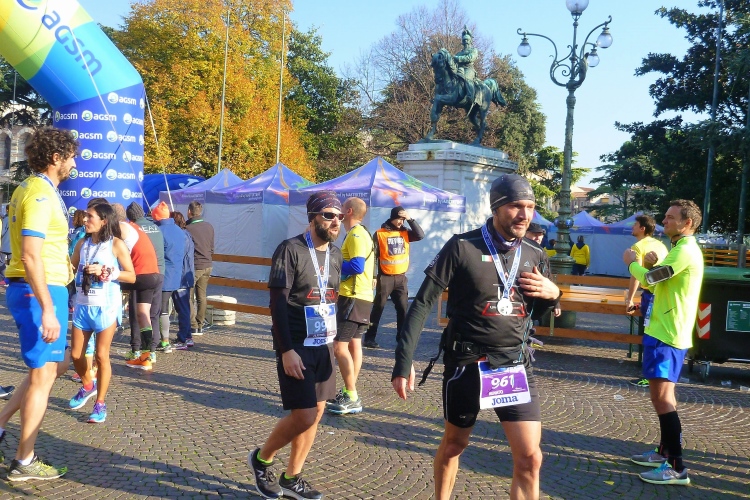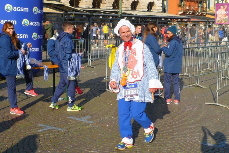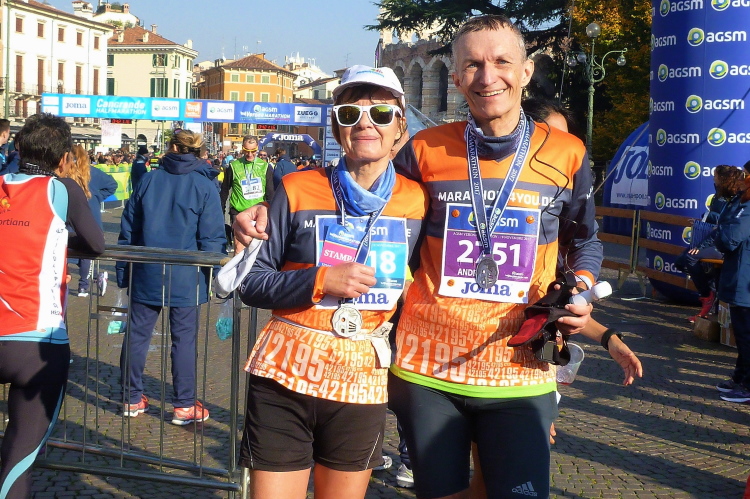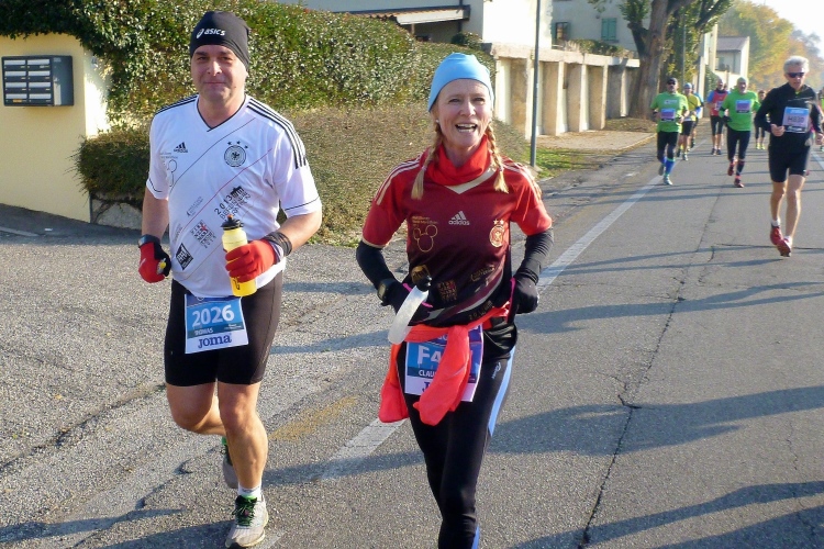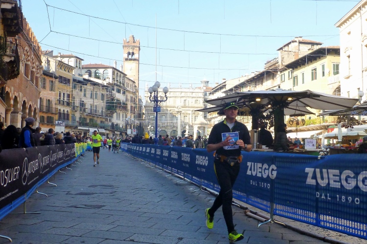 Uns bietet sich ein schöner Blick auf die Häuserzeile an der Piazza Bra. Da tobt der Bär. Die letzten Meter geht es über einen Teppich in den Farben der italienischen Tricolore. Der Ungar, der mich zwei Meter vor dem Zielbogen überholt, wird sich wundern, dass ich netto zwei Minuten vor ihm liege. Mit 4:08 h bei idealen Bedingungen bin ich nicht ganz zufrieden. Judith sehe ich nun auch wieder. Sie freut sich über 3:58. Da in Verona diesmal auch die italienischen Meisterschaften ausgetragen werden, liegt der Median der Ergebnisse heute bei flotten 3:41 h. Dementsprechend beeindruckend sind auch die Zeiten der Altersklassensieger.