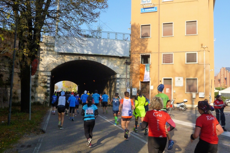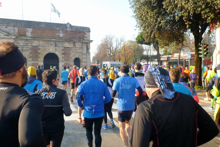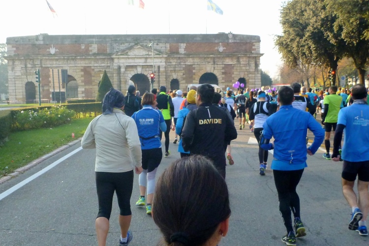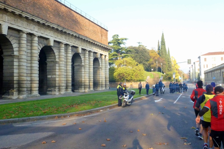 Die Startblöcke sind farblich markiert, Marathonis und Halbmarathonis machen sich um 9:00 Uhr gemeinsam auf den Weg. Noch schnell ein paar Fotos, dann ist Judith verschwunden. Ich gehe zügig zu meinem Startblock und komme noch hinein, bevor sich der Tross in Bewegung setzt. Wann kommen endlich die blauen Startnummern, wie auch Judith eine hat? Drei Minuten warte ich, dann treffe ich schon auf Läufer mit den grauen Nummern aus dem langsamsten Bereich. Also laufe ich ohne Judith los. Durch ein großes Tor in der mittelalterlichen Stadtmauer geht es auf den Startbogen zu. Einen Kilometer auf dem breiten Corso Porta Nuova. Viele Fahrspuren, sodass ich sofort mein offensichtlich schnelles Tempo laufen kann. Vor uns das Porta Nuova genannte Tor aus dem 16. Jahrhundert, der Hauptbahnhof dahinter ist nach ihm benannt. Nach dem Ende der Republik Venedig kam Verona 1797 unter österreichische Herrschaft und man beschloss, die Stadt in das oberitalienische Festungsviereck einzugliedern. Von 1833 bis 1866 wurden um Verona herum diverse Wehranlagen errichtet, die vielfach noch erhalten sind und uns heute in Form von schönen Parklandschaften noch öfter begegnen werden.
