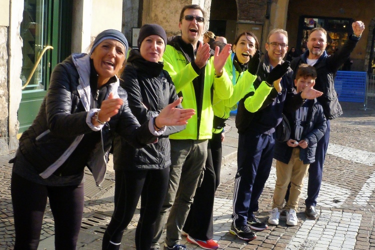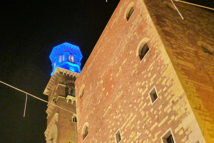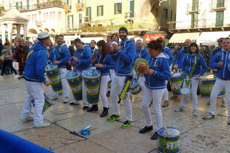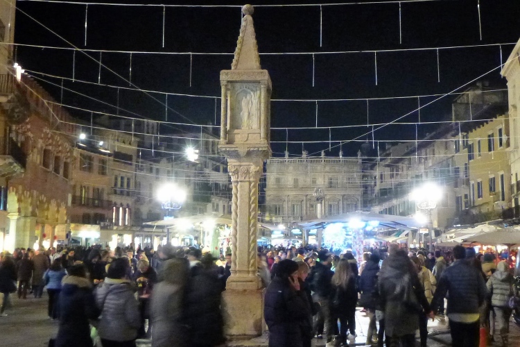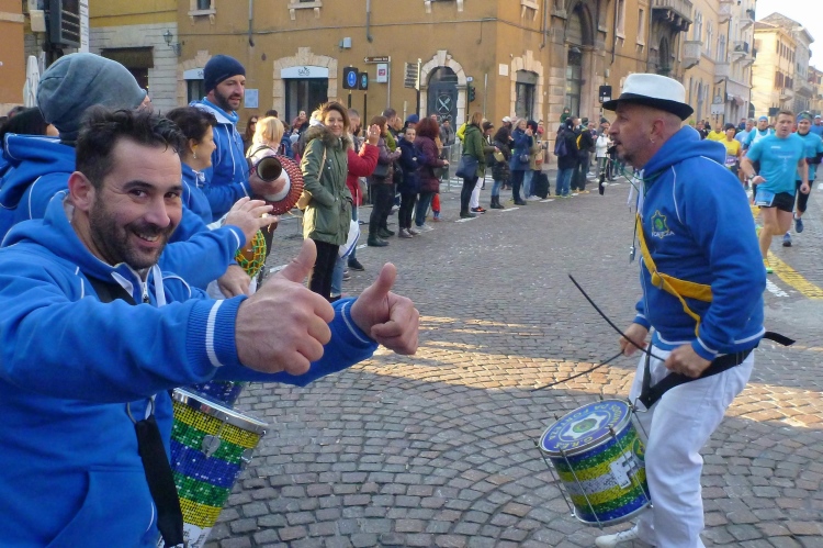 Auf das ehemalige römische Forum, die Piazza delle Erbe. Da ist unheimlich was los. Die Sambatruppe ist inzwischen hier angekommen und erfreut mit ihren Rhythmen auch die vielen Einheimischen. Links das Rathaus mit dem hohen Turm. Eine Besteigung ist nach dem Marathon Pflicht, die Aussicht beeindruckend. Auf dem Platz hinter dem Rathaus hat übrigens schon der Weihnachtsmarkt begonnen. Die vielen Lämpchen über den Straßen waren aber gestern Abend leider noch nicht eingeschaltet.