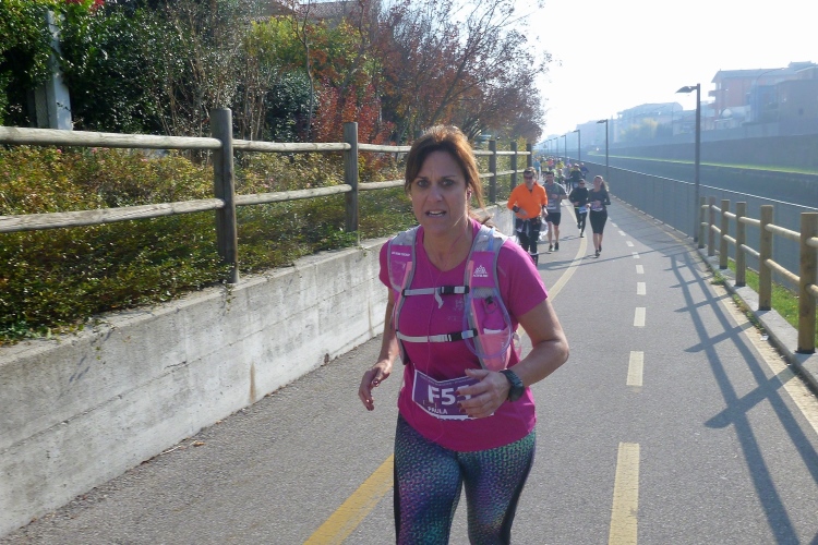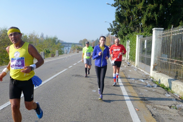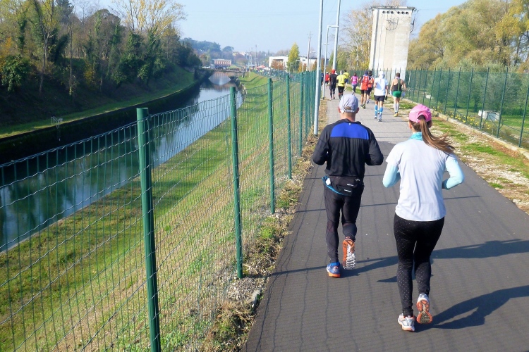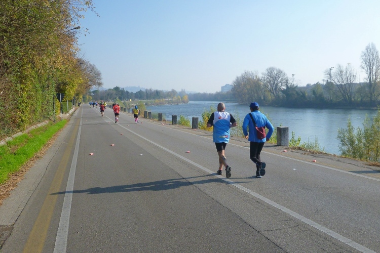 Aber noch sind wir nicht so weit. Mit der tief stehenden Sonne im Rücken geht es bis km 8 auf dem Lungadige Attiraglio dahin, bevor eine Flussschleife den Blick auf eine wunderschöne Hügellandschaft freigibt. Am gegenüberliegenden Ufer kommt Wasser aus zwei Tunneln in den Fluss. Viele Schwäne und andere Vögel sind unterwegs. Ich überhole einen Läufer, der von einem offiziellen Fahrrad begleitet wird. „La Tigre“, so sein Spitzname, wird oft angefeuert. Wahrscheinlich ein Prominenter? Ich selbst werde mehrmals gefragt, warum ich hier fotografiere. Und dann lobt man mich auch gleich noch dafür, dass ich den ganzen und nicht etwa den halben Marathon laufe. Sehe ich wirklich so alt aus? Ich werte das Ganze lieber als Kompliment.