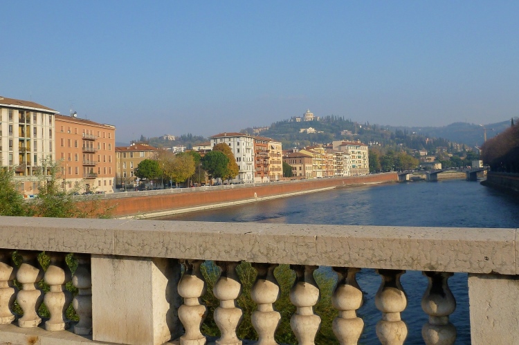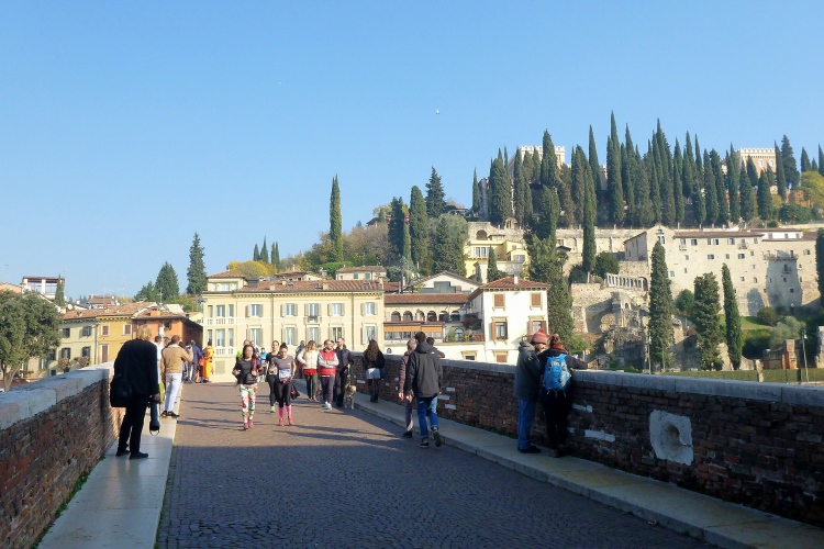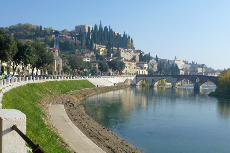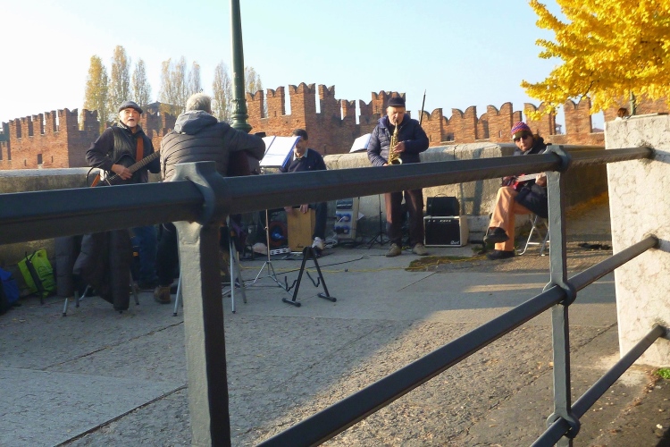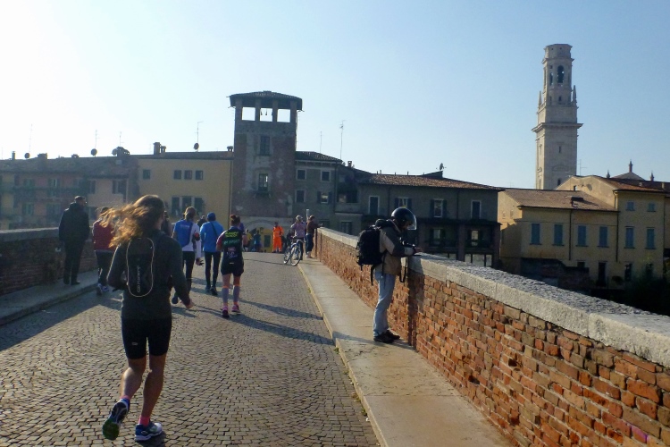 An der Porta Palio drehen wir wieder nach rechts und laufen auf dem Corso Cavour auf das Stadtzentrum zu. Linker Hand das Castelvecchio aus dem 14. Jahrhundert, eine Burg der Herrscherfamilie della Scala, auch Scaliger genannt. Ein Schmuckstück, über das allein viele Städte froh wären. Aber Verona hat ja noch so viel mehr zu bieten. Das Kopfsteinpflaster stört hier bei km 2 noch nicht, aber wir kommen ja wieder her. Die Altstadt liegt in einer Schleife der Etsch (ital. Adige) und für uns geht es über die 1928 errichtete Ponte della Vittoria mit ihren vier Brückenmonumenten und dann 10 Kilometer stromaufwärts. Vor uns ragt das Castello aus dem Morgendunst. Eine mittelalterliche Brücke verbindet sie mit unserem Ufer. Dort gibt es oft Verkaufsstände und natürlich Musikanten. An unserem Brückenkopf hat sich eine Combo aufgestellt und macht super Stimmung. Auch in fast zwei Stunden, wenn wir wieder hier vorbeikommen, wird die Musikgruppe noch aktiv sein.