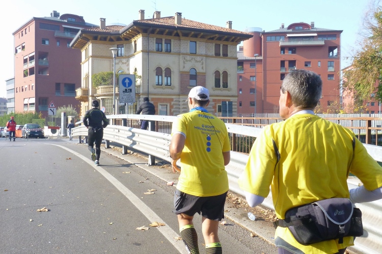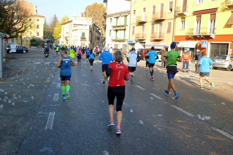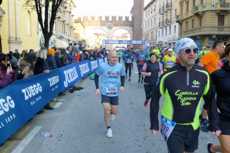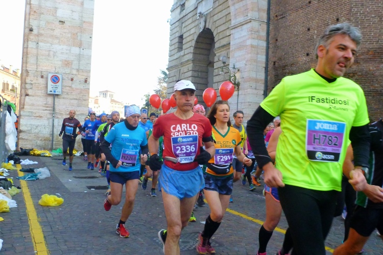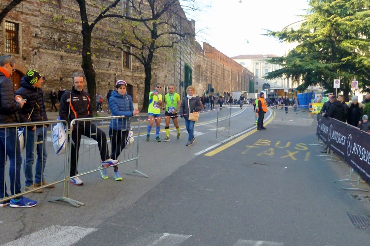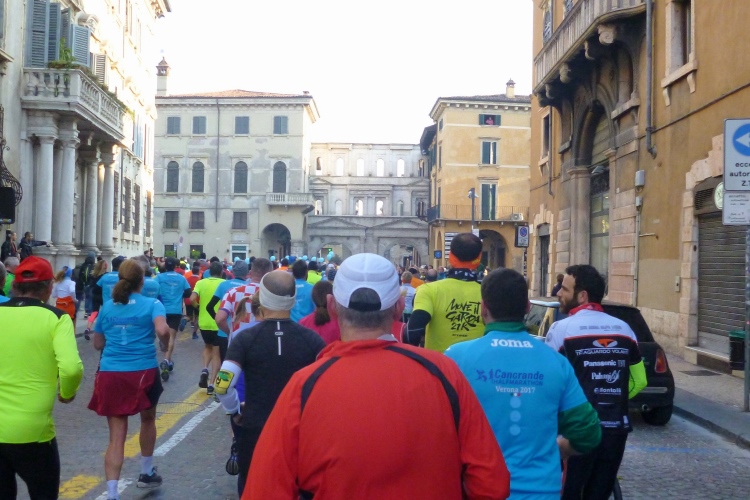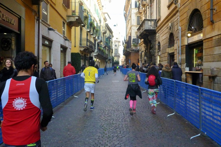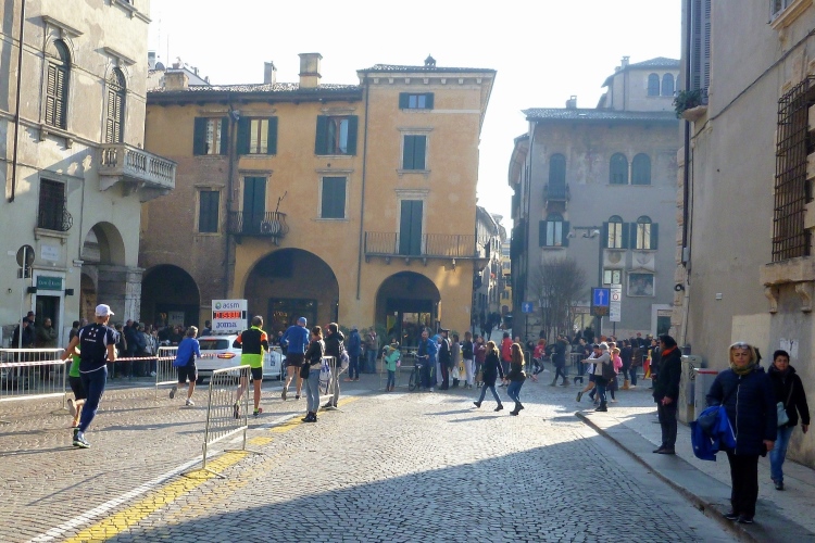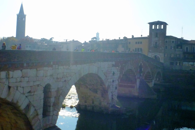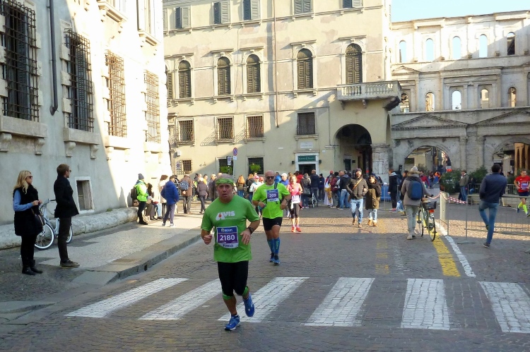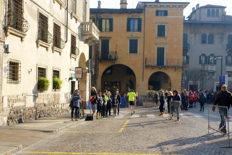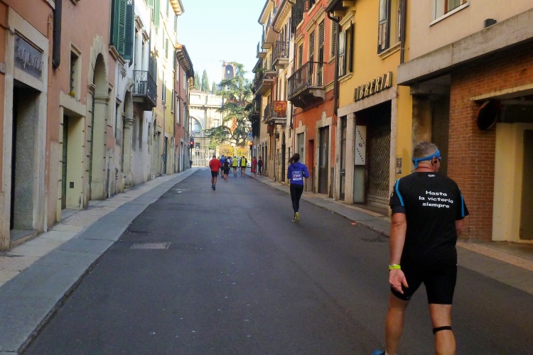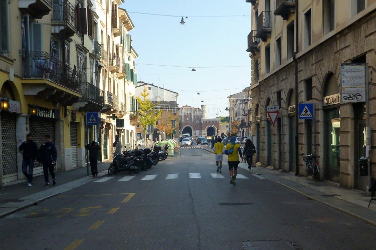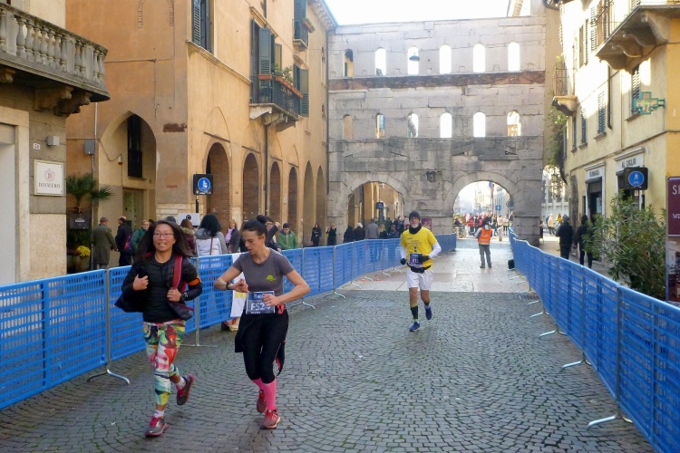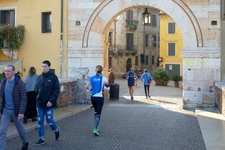 Über die Ponte Pietra zurück in die Altstadt. Die römische Brücke aus dem Jahre 100 v. Chr hielt bis zum 15.4.1945, als sie von der Wehrmacht beim Rückzug gesprengt wurde, wie auch alle anderen Brücken in Verona. Bis 1959 wurde die Brücke wieder aufgebaut. Sie enthält Elemente aus der Römerzeit, der Scaliger-Epoche und der venezianischen Zeit. Für viel Stimmung sorgen einige Italienerinnen, bevor es durch das Stadttor auf die Gässchen geht. Die Streckenführung ist phänomenal. Endlich laufen auch wir, wie schon vorher die Halbmarathonis, durch das römische Stadttor Porta dei Borsari. Der Corso Bortoni Borsari ist für uns auf beiden Seiten abgesperrt. Fußgänger und die wenigen Touristen, die im November hier sind, können an vielen Stellen gesichert queren.