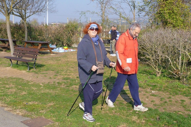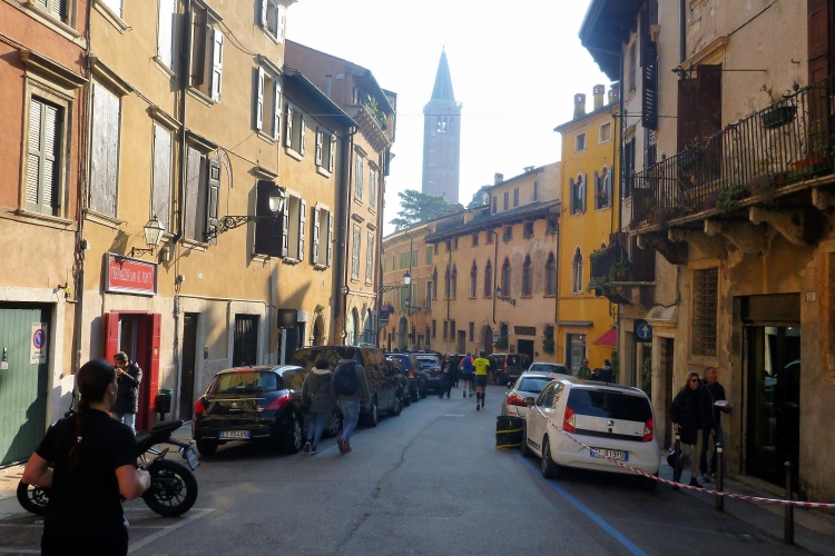 San Zeno ist ein romanischer Bau aus dem 11. und 12. Jahrhundert, attraktiv umrahmt von zwei Türmen und mit einer Fassade, die durch eindrucksvolle Farbgebung, einen harmonischen Baustil und schlichte Verzierungen besticht. Die Basilika ziert übrigens in diesem Jahr die Medaille des Verona Marathons. An der nächsten Kreuzung warten mehrere dunkelhäutige Fußballer auf ihren Einsatz und haben, auch ohne uns wahrzunehmen, viel zu lachen. An der Porta San Zeno vorbei. Chiesa San Bernadino mit ebenso genannter Gasse. Schade, dass hier so wenige Zuschauer sind. Porta Palio: Wir verlassen die Festungsstadt.
