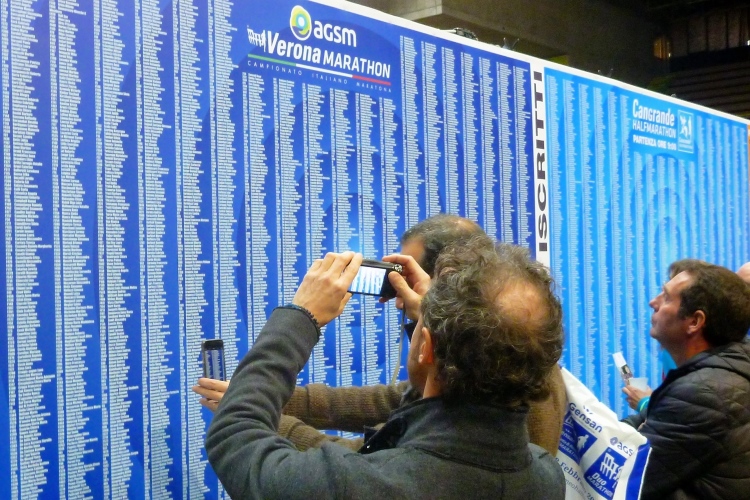 Die Marathonmesse findet neben dem großen Stadion in der Multifunktionshalle des Energieversorgers und Titelsponsors AGSM statt. Aus Umweltschutzgründen drucke ich schon lange keine Abholzettel mehr aus. Leider wäre hier aber noch eine Erklärung zu unterzeichnen gewesen, mit der man sich verpflichtet, den Leihchip am Ende der Veranstaltung zurückzugeben. Völlig problemlos erhalte ich einen kleinen Vordruck, auf dem Name und Startnummer eingetragen werden. Unterschreiben und fertig. Entgegen meinen üblichen Erfahrungen mit italienischer Bürokratie also mal etwas Positives. Und ich habe ein halbes Blatt Papier gespart.