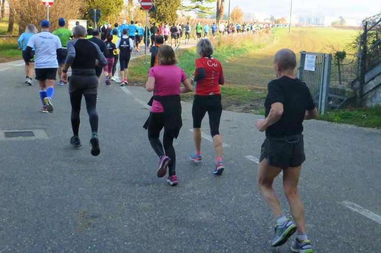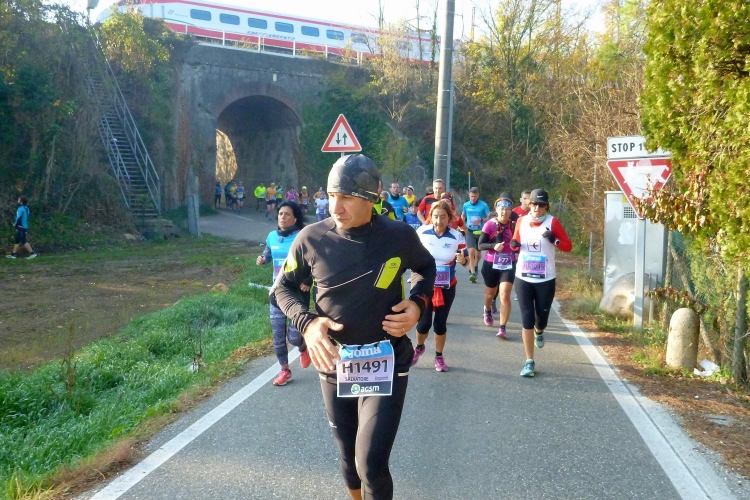 Vor uns ein leichter Linksknick der Straße mit schönen alten Bäumen. Dort biegen wir bei km 12 nach rechts, wieder unter der Brennerbahn hindurch, über uns ein Freccia-Bianca- Hochgeschwindigkeitszug. Durch Felder geht es dahin, bis wir einen Kilometer später auf einer Landstraße wieder Richtung City unterwegs sind. Gefühlt war das auch unsere höchste Stelle auf einem recht flachen Kurs. So 75 Höhenmeter habe ich für den gesamten Lauf errechnet. Noch mal durch Parona, sogar ein kleiner Tunnel steht auf dem Programm, dann schwenken wir auf eine breite Einfallstraße Richtung Verona. Eine schmale Spur ist für den Autoverkehr in Gegenrichtung reserviert. Für uns bleibt viel Platz. Zwei Kilometer zersiedeltes Gewerbegebiet stehen an. Dazwischen ein Herr, der sein Pferd mitgebracht hat. Muss ja nicht immer nur der Hund ausgeführt werden.