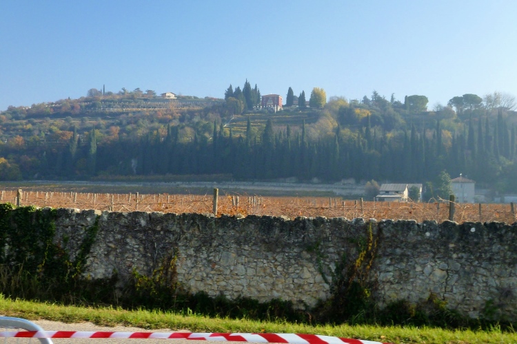 Links in den Weinbergen ein beeindruckender Palazzo, umgeben von riesigen Zypressen. An der Straße auch eine Kellerei. Hier sind diese Anlagen viel größer, als wir sie bei unseren diesjährigen Läufen durch diverse mitteleuropäische Weinbauregionen kennengelernt haben. Der Valpolicella kommt aus dieser Gegend. Schon nach zwei Kilometern geht es wieder in die Stadt Verona. Über eine Brücke queren wir die Etsch samt der Laufstrecke von km 6. Einige Belgierinnen feuern uns an.