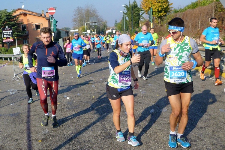 Es folgt eine einen Kilometer lange Begegnungsstrecke auf dem Lungadige, wo wir anfangs schon gewesen sind. Die Verpflegungsstelle erwartet uns nach den Vorgaben der FIDAL alle fünf Kilometer und hier genau bei km 30. Es gibt Wasser, Iso-Getränke, warmen Tee und Bananen sowie hier auch ein Fruchtgel vom Sponsor. Jonathan, den wir in Turin kennengelernt haben und der uns dringend empfohlen hatte, nach Verona zu kommen, grüßt mich. Er ist 1,5 km vor mir. Dann sehe ich Judith knapp vor den Vier-Stunden-Pacern. Da werde ich nichts mehr aufholen können. Von Kilometer 31 bis 35 geht es nun auf dieser schönen Straße entlang der Etsch wieder Richtung Zentrum. Viele können zügig vor sich hin laufen, flussabwärts sozusagen. Ich hingegen beginne zu kämpfen. Hier täte musikalische Unterstützung gut. Am großen Krankenhaus Ospedale Civile Maggiore vorbei. Apropos: Bisher habe ich noch niemanden vom Roten Kreuz gesehen. Dafür, dass es sich um einen internationalen Marathon handelt, verlässt man sich in Verona schon sehr stark auf die gute Gesundheit der Teilnehmer.