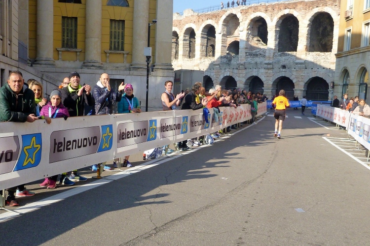 Eine Umrundung der Arena steht an. Beim Romeo-und-Giulietta-Halbmarathon, der im Februar ausgetragen wird, führte die Strecke bisher immer durch die Arena hindurch. Opernvorführungen finden ja nur im Sommer statt. Judith und ich hatten das Glück, 2010 beim „Last 10k“ in die Arena einzulaufen. Leider wurde das Ziel inzwischen verlegt. Ein „Triumphzug“ in das Wahrzeichen Veronas wäre natürlich jetzt nach all den Strapazen das Tüpfelchen auf dem i gewesen. 300 Meter vor dem Ziel stolpere ich und kann unter dem Beifall unzähliger Zuschauer den Sturz gerade noch abfangen.