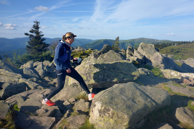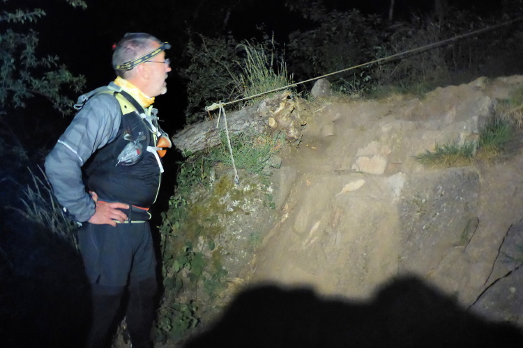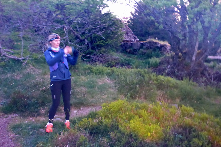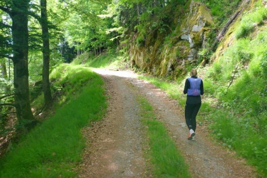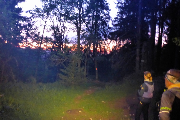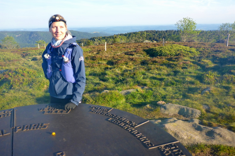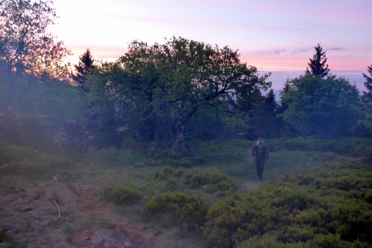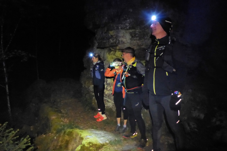 Für uns beginnt hier der erste lange Aufstieg nach Aubure, dem höchst gelegenen Ort im Elsass. Im Wald ist es stockfinster. Doro bleibt an einem Stein hängen und stürzt. Sie landet mit dem Knie unglücklicherweise direkt auf einem Stein. Das sieht nicht gut aus. Sie beißt auf die Zähne und läuft weiter. Vielleicht wird es ja gleich wieder besser. Am Roche du Tetras, einer schönen Gesteinsformation, haben wir den höchsten Punkt erreicht. Jetzt geht es wieder bergab bis zu unserem ersten Verpflegungspunkt in Aubure. Wir queren eine Kuhweide, wo uns die verdutzten Tiere hinterherblicken. Für Doro ist an der Verpflegung Schluss. Sie versorgt das blutende Knie und ist traurig, dass für sie die Reise schon nach 20 Kilometern endet.