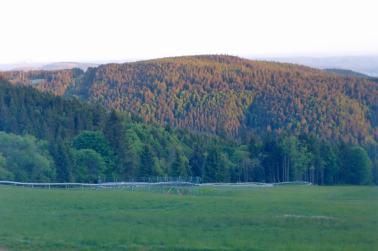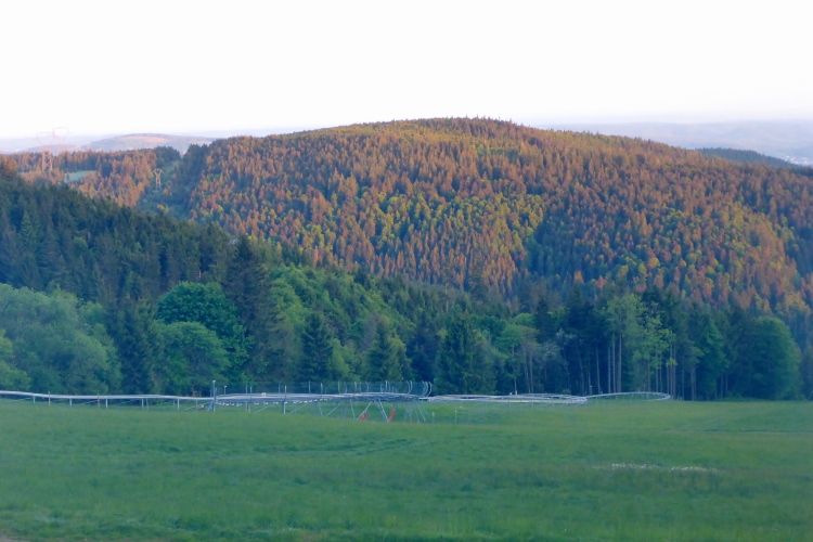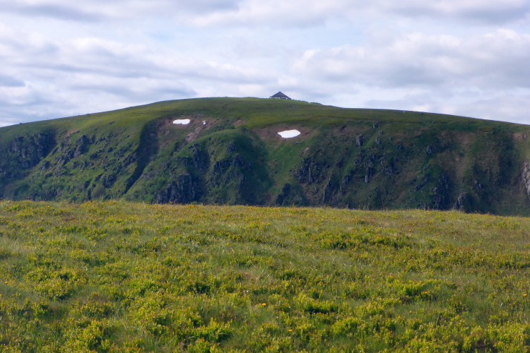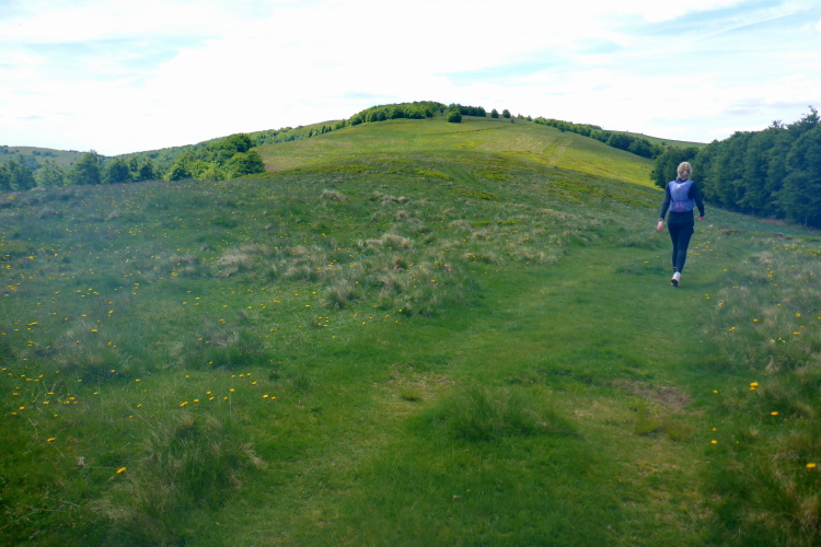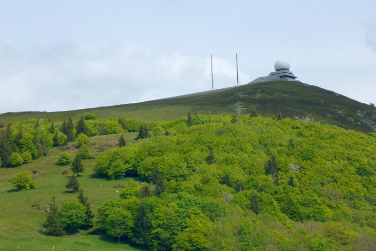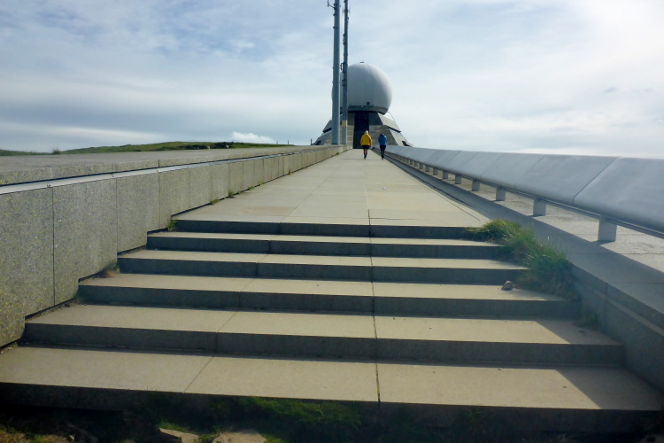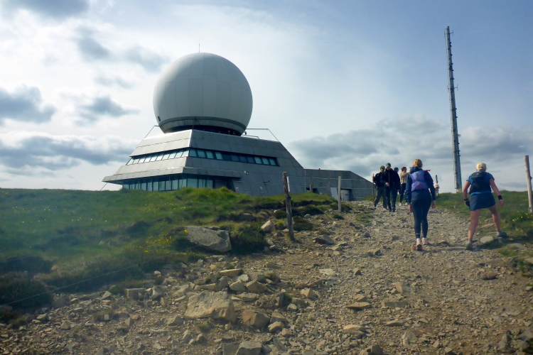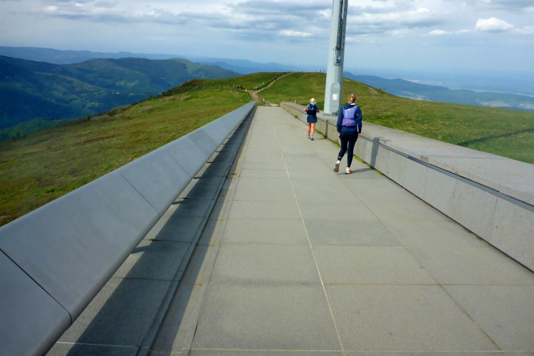 Nach 10 Minuten geht es gemeinsam auf den Zielsprint zum Grand Ballon. Die Läufer der schnellen Truppe sind mit Julia, die ebenfalls in Le Bonhomme zugestiegen ist, noch weit hinter uns und so lassen wir es gemütlich die letzten acht Kilometer und 400 Höhenmeter angehen. Schon von Weitem sehen wir die große Radarstation auf dem Gipfel. Der Grand Ballon oder auch das Große Bellchen ist der höchste Gipfel der Vogesen mit 1.423 Meter über dem Meer. Es wird wieder frisch und dunkle Wolken ziehen heran.