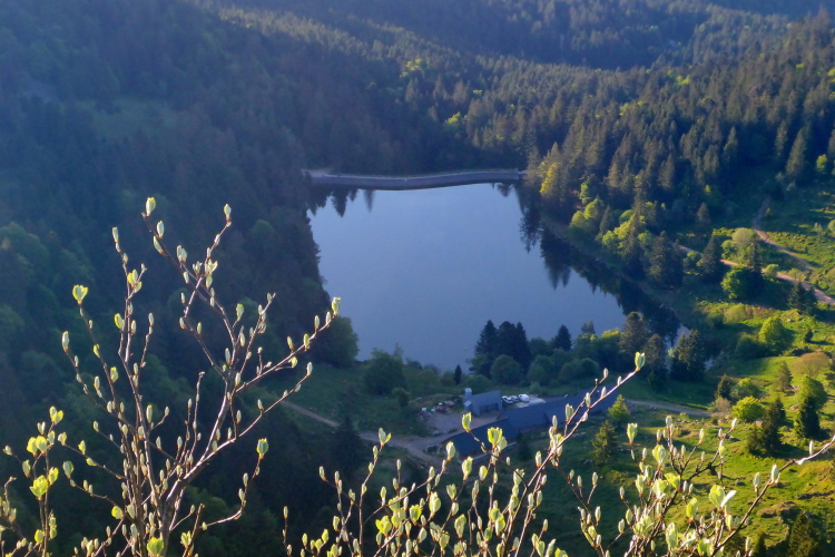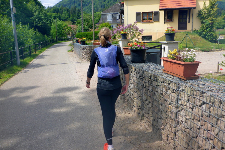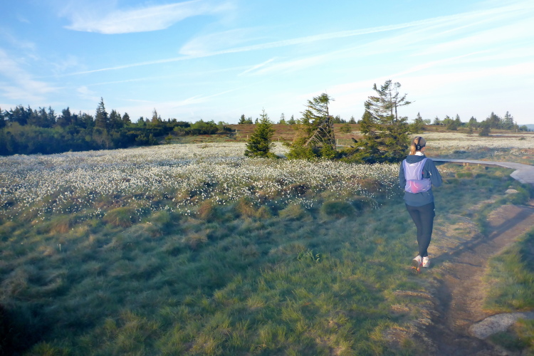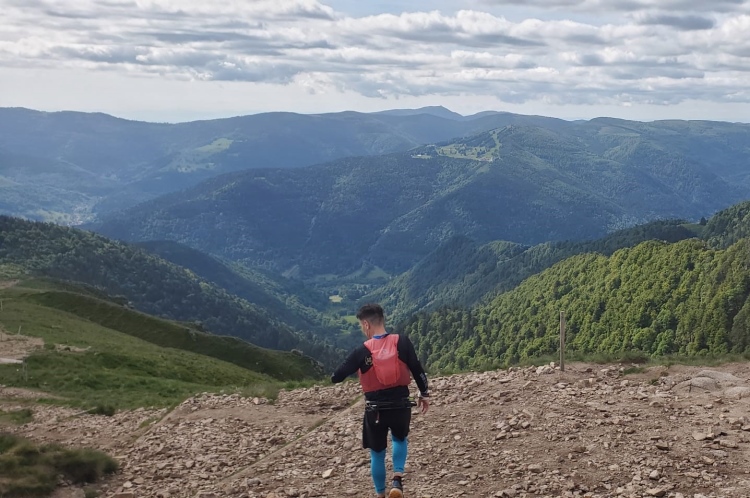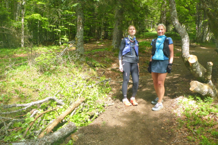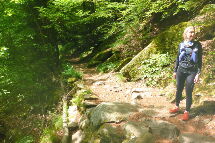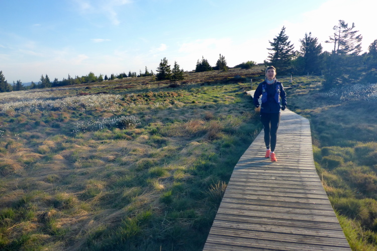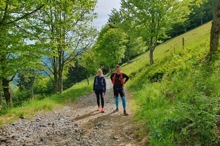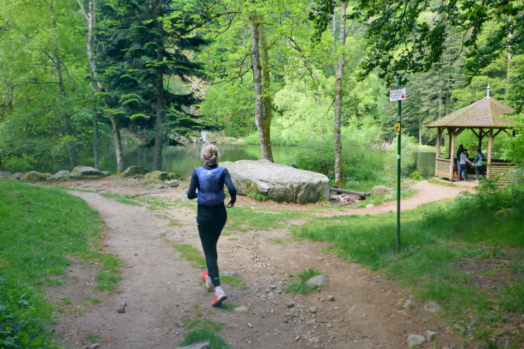 Ab hier wird auch die Strecke deutlich einfacher. Breite Wege führen uns in moderater Steigung durch einen Märchenwald. Immer wieder blühende Kuhweiden und fantastische Ausblicke begleiten uns zum Gipfel Le Hohneck, der mit seiner Hütte schon von weitem sichtbar ist. Zum Grand Ballon, unserem Tagesziel sind es von hier aus Luftlinie noch 27 Kilometer. Das ist überschaubar. Dazwischen liegt allerdings noch ein langer Downhill und ein entsprechender Gegenanstieg von 1.000 Höhenmetern. Aber alles halb so wild. Der Downhill lässt sich perfekt laufen. Ab dem Lac de Schiessrothried geht es an vielen kleinen Weiheranlagen und unzähligen Wasserfällen entlang, bis ins Tal nach Mittlach. Viele Wanderer sind auf der Strecke, die uns immer sehr höflich Platz machen. Auch einige Trailrunner sind unterwegs. Wir genießen die Strecke sehr. Es ist jetzt angenehm warm und von Müdigkeit keine Spur. In Mittlach müssen wir auf unsere Verpflegung warten. So früh haben sie nicht mit uns gerechnet. Es läuft aber auch tatsächlich sehr gut bei uns heute.