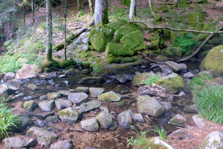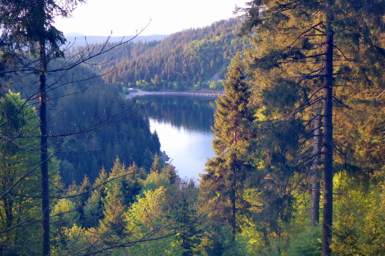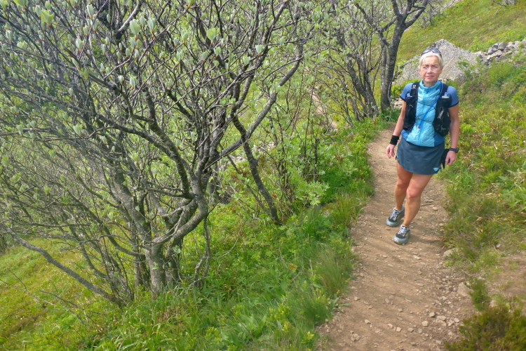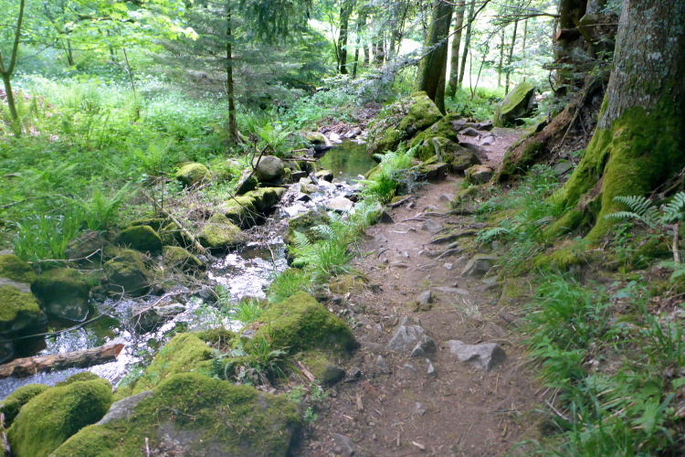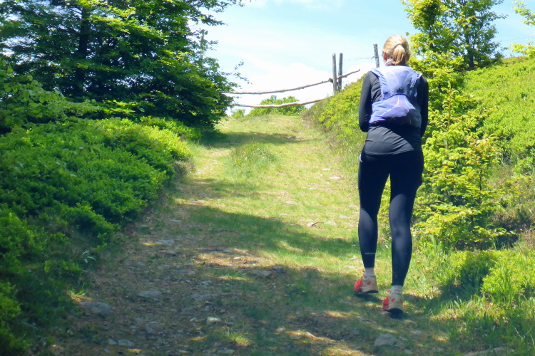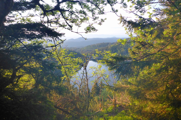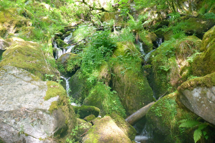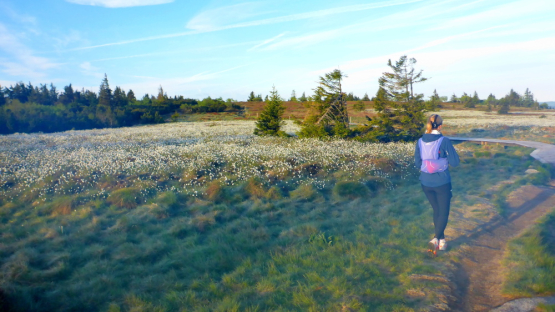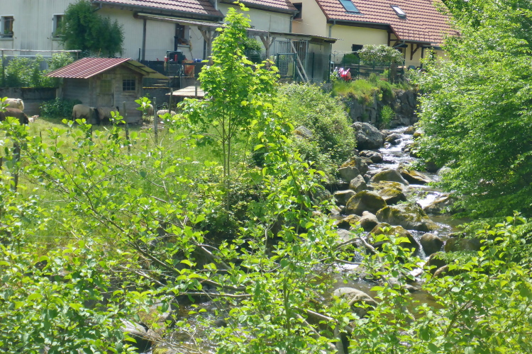 Ab hier wird auch die Strecke deutlich einfacher. Breite Wege führen uns in moderater Steigung durch einen Märchenwald. Immer wieder blühende Kuhweiden und fantastische Ausblicke begleiten uns zum Gipfel Le Hohneck, der mit seiner Hütte schon von weitem sichtbar ist. Zum Grand Ballon, unserem Tagesziel sind es von hier aus Luftlinie noch 27 Kilometer. Das ist überschaubar. Dazwischen liegt allerdings noch ein langer Downhill und ein entsprechender Gegenanstieg von 1.000 Höhenmetern. Aber alles halb so wild. Der Downhill lässt sich perfekt laufen. Ab dem Lac de Schiessrothried geht es an vielen kleinen Weiheranlagen und unzähligen Wasserfällen entlang, bis ins Tal nach Mittlach. Viele Wanderer sind auf der Strecke, die uns immer sehr höflich Platz machen. Auch einige Trailrunner sind unterwegs. Wir genießen die Strecke sehr. Es ist jetzt angenehm warm und von Müdigkeit keine Spur. In Mittlach müssen wir auf unsere Verpflegung warten. So früh haben sie nicht mit uns gerechnet. Es läuft aber auch tatsächlich sehr gut bei uns heute.