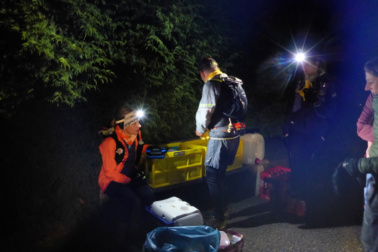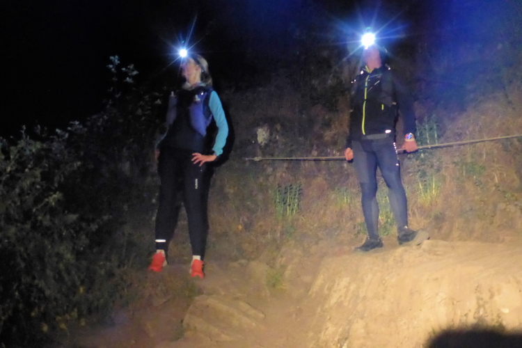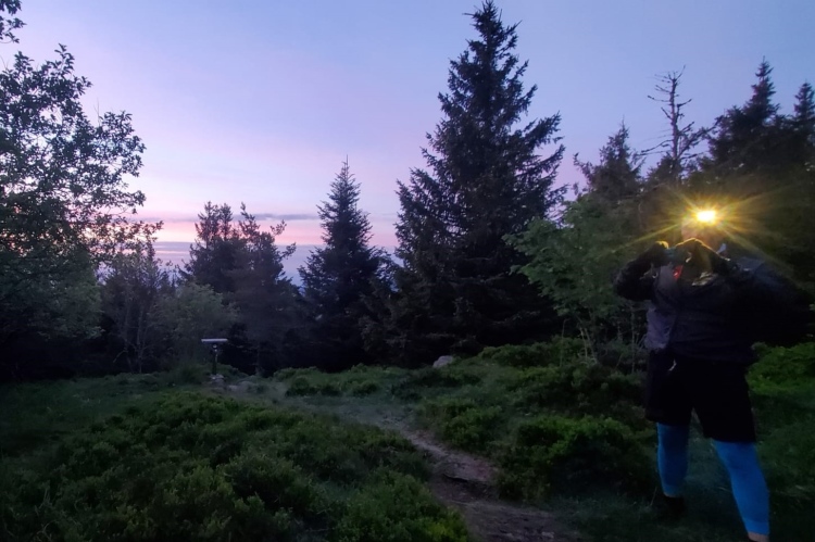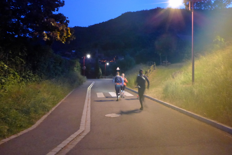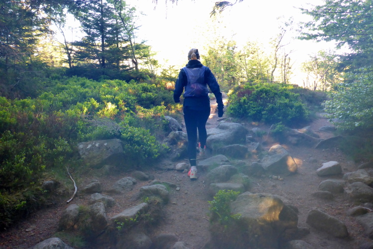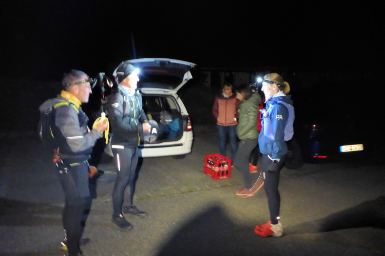 Für uns geht es unspektakulär weiter bergauf. Die Geologie wechselt. Statt Grauwacke dominiert ab dem Col de Rehberg der Granit. Es wird steiniger. Wir laufen schweigend durch den bitterkalten Wald. Ab und an leuchtet die schmale Sichel des Mondes durch das Blätterdach. Dann der Ruf einer Eule. Der Boden ist gefroren und mit Raureif überzogen. Es geht mehrere Kilometer nur flach bergab und wir lassen es gemütlich rollen. In Le Bonhomme haben wir bei Kilometer 37 die zweite Verpflegung erreicht. Die Mädels erwarten uns schon. Ich nehme einen warmen Kaffee, esse aber nur wenig. Mein Biorhythmus steht noch auf Tiefschlaf und ich will keine Magenprobleme provozieren. Doros Knie ist angeschwollen und ich bin froh, dass sie sich nicht weitergequält hat.