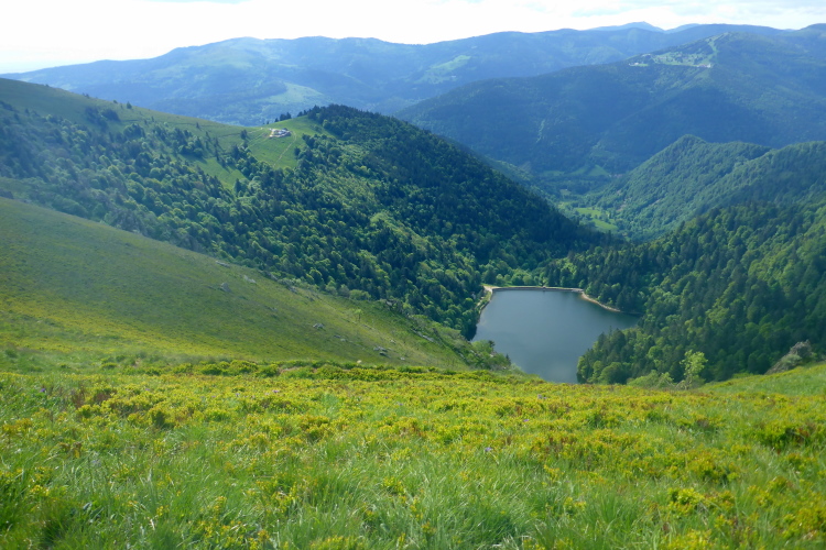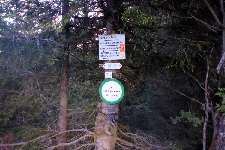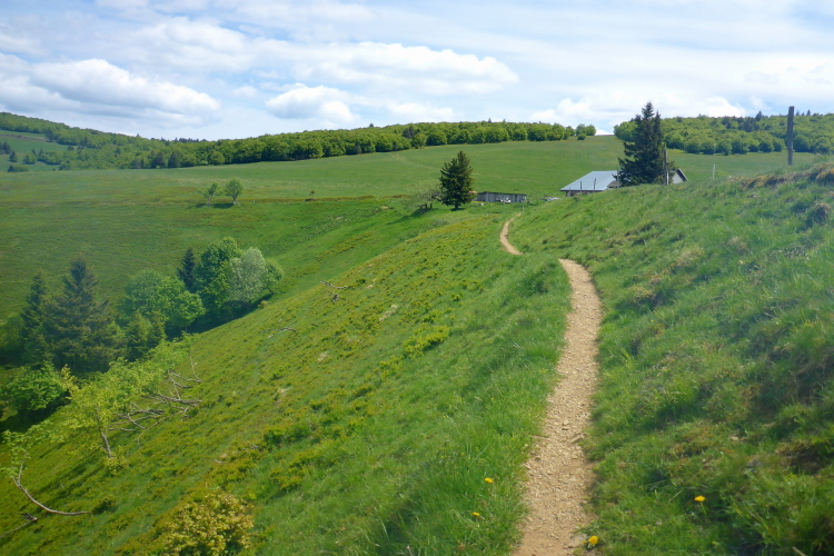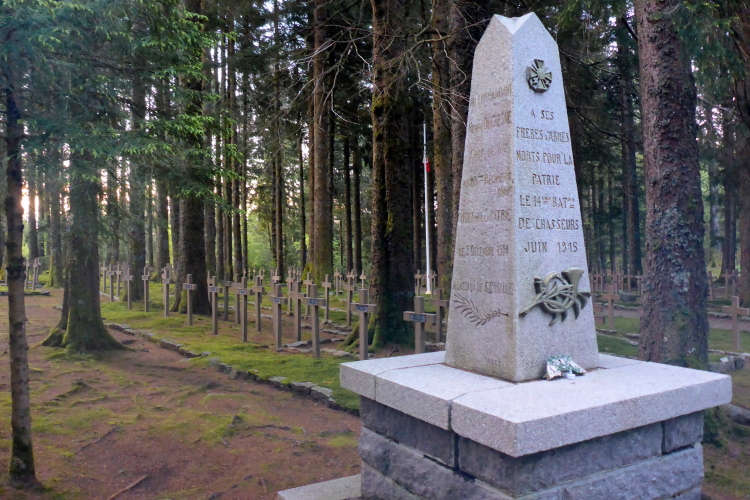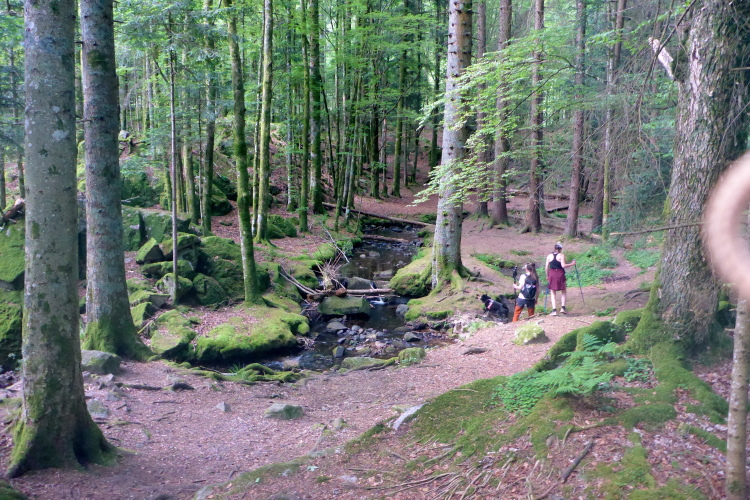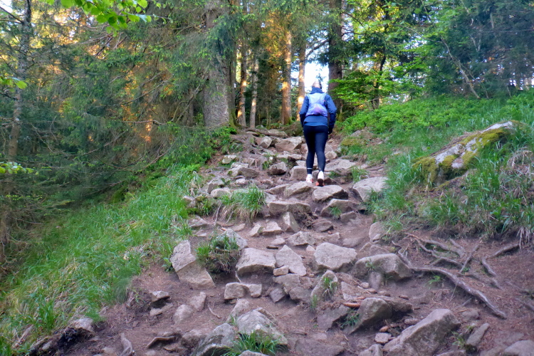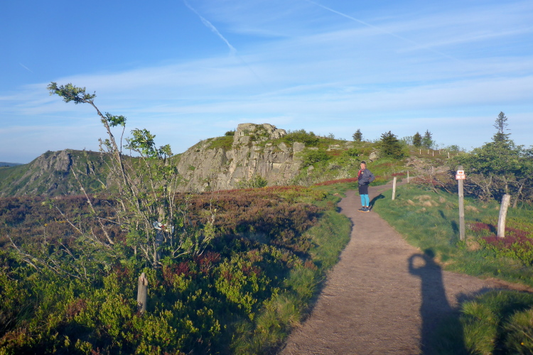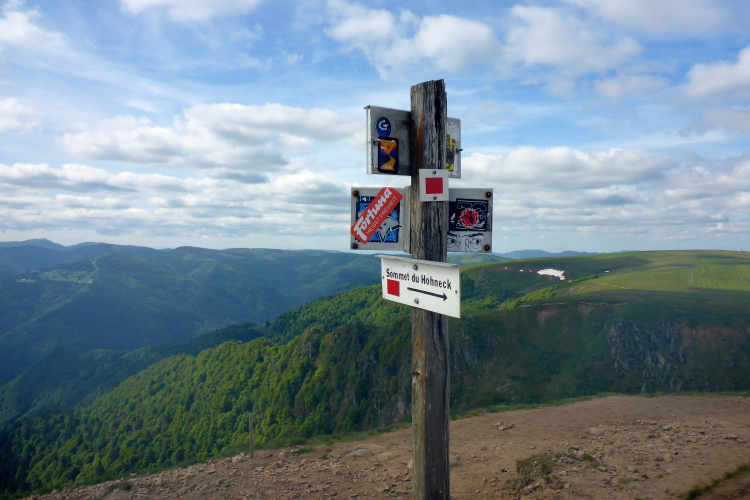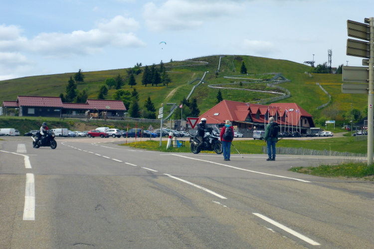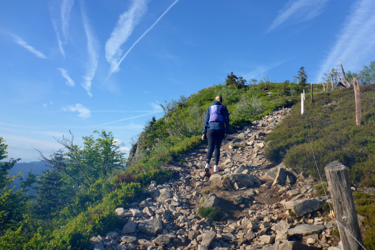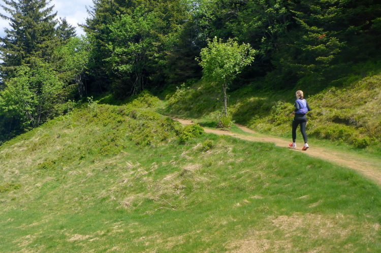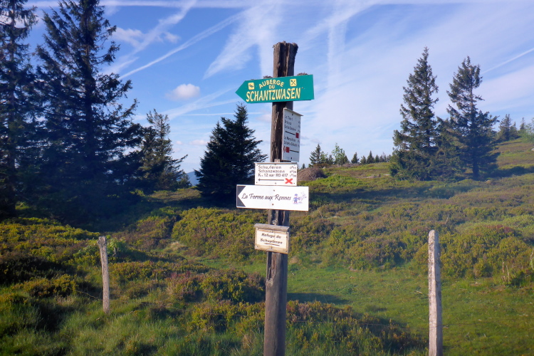 Wir laufen oberhalb der Skiliftanlagen auf grobem Blockwerk über Blumenwiesen und haben freie Aussicht bis zu den Alpen. Vorbei an steilen Abbrüchen geht es in stetigem Auf und Ab über die baumlose Hochebene, bis wir nach einem steinigen Downhill durch einen Märchenwald den Col de La Schlucht erreichen. Der Pass bildete früher die Grenze zwischen Frankreich und dem deutschen Reich und damit auch die Sprachgrenze. Er ist ein beliebter Klassiker bei der Tour de France und mit der anschließenden Route des Crêtes, eine beliebte Ausflugsstrecke für Radfahrer. Auf uns wartet hier die nächste Verpflegung.