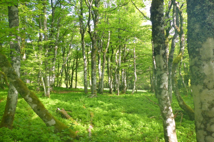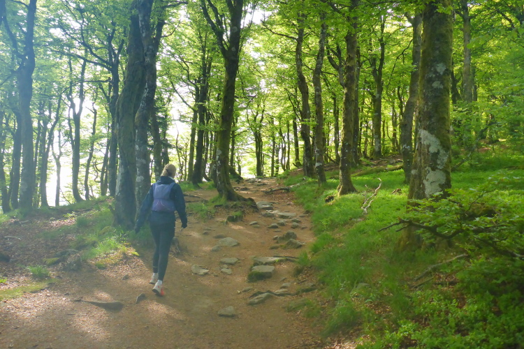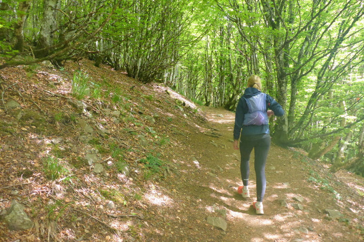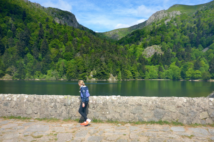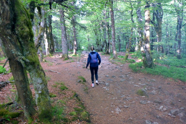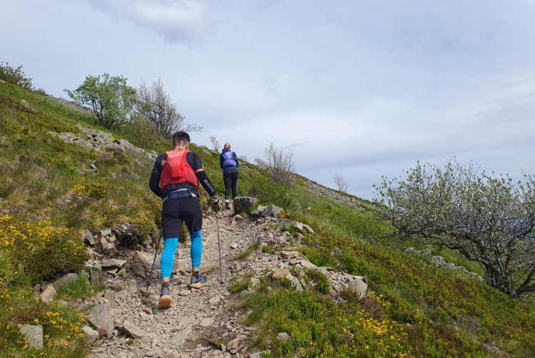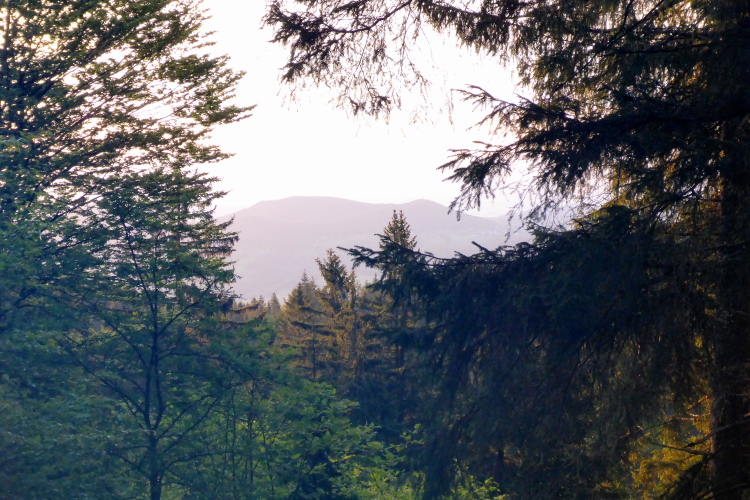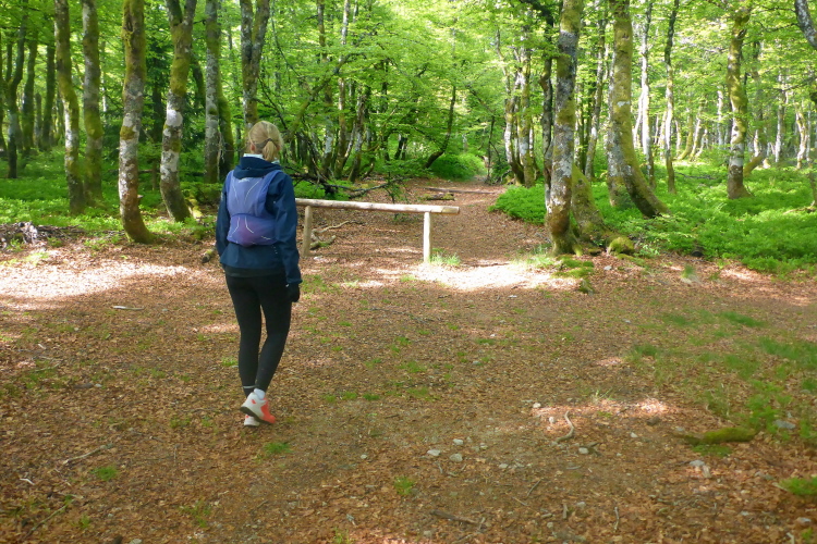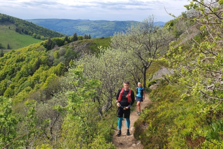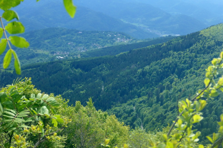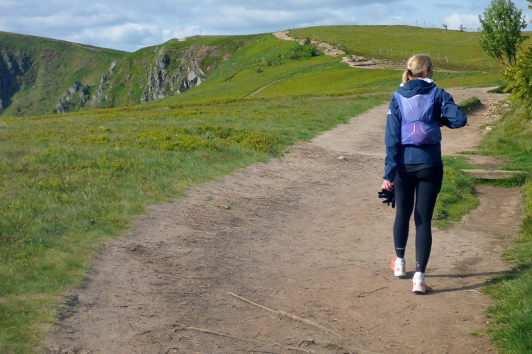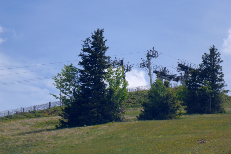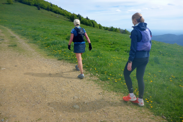 Wir laufen oberhalb der Skiliftanlagen auf grobem Blockwerk über Blumenwiesen und haben freie Aussicht bis zu den Alpen. Vorbei an steilen Abbrüchen geht es in stetigem Auf und Ab über die baumlose Hochebene, bis wir nach einem steinigen Downhill durch einen Märchenwald den Col de La Schlucht erreichen. Der Pass bildete früher die Grenze zwischen Frankreich und dem deutschen Reich und damit auch die Sprachgrenze. Er ist ein beliebter Klassiker bei der Tour de France und mit der anschließenden Route des Crêtes, eine beliebte Ausflugsstrecke für Radfahrer. Auf uns wartet hier die nächste Verpflegung.