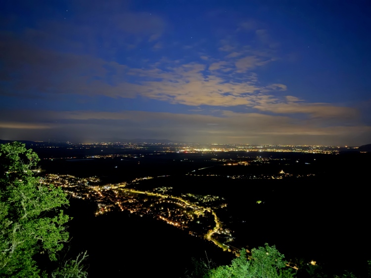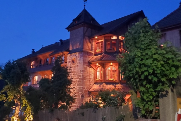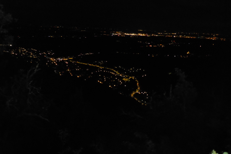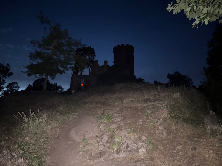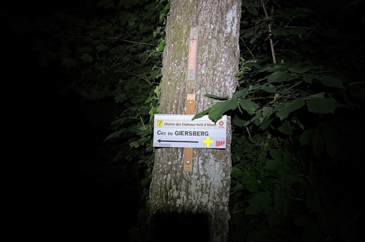 Hinter Thannenkirch geht es erst mal ein Stück bergauf. Damit verschwindet auch die Kälte aus den Knochen. Unter uns sehen wir die Lichter von Ribeauvillé und Colmar. Im steilen, holprigen Abstieg passieren wir die Ruinen der Burg Giersberg. Der ehemalige Stammsitz von Buki, meinem Lauffreund, der heute leider nicht dabei sein kann. Die Herren von Ribeaupierre ließen insgesamt drei Wehrburgen bauen, deren Ruinen heute über einen Wanderweg gut zu besuchen sind. Eine große Wandergruppe mit Kindern und Jugendlichen kommt uns entgegen. Sieht so aus, als wird heut Abend noch gefeiert. Zwischen Rebstöcken erreichen wir den schönen historischen Ort, von dem wir aber nur die Stadtmauer sehen. Ribeauvillé konnte sich seinen mittelalterlichen Charme mit seinen kleinen Gassen und Wehrtürmen weitestgehend bewahren und eignet sich vorzüglich für ein gemütliches Wochenende zu zweit.