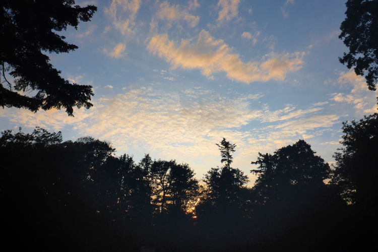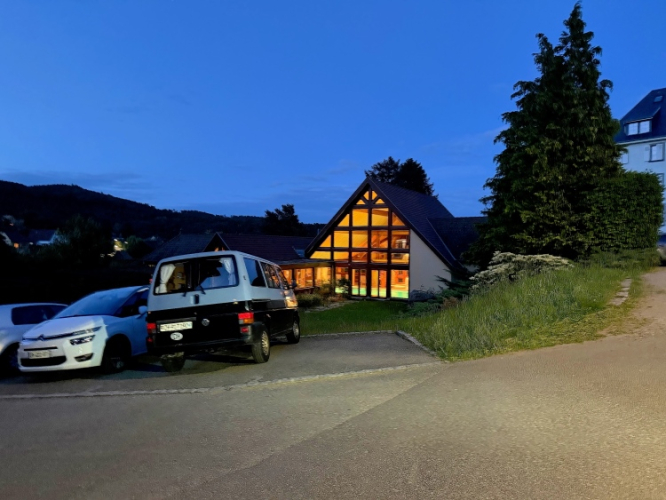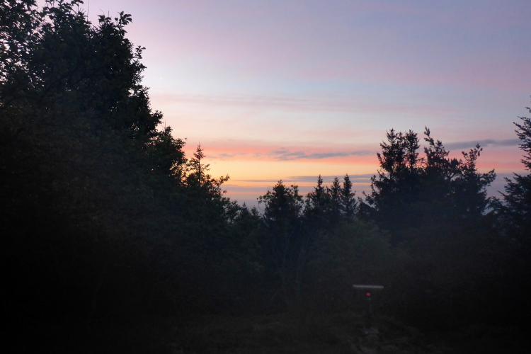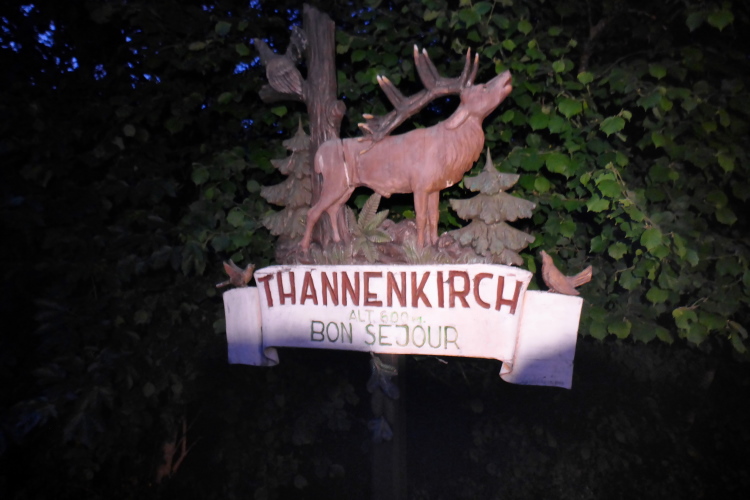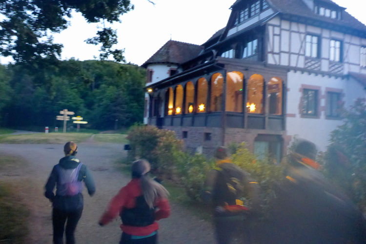 Im Wald brauchen wir von Anfang an die Stirnlampen. Es ist kalt und wir geben ordentlich Gas, um die Kälte zu vertreiben. Schon nach wenigen Kilometern laufen wir durch das idyllische Thannenkirch. Durch die Fenster der heimeligen Weinstuben sehen wir die Touristen beim Abendessen und fragen uns, ob wir auf der richtigen Seite des Fensters sind. Der wunderschöne Sternehimmel im ausgehenden Tageslicht vertreibt aber alle Zweifel. Wir sind gut gelaunt und freuen uns auf das selbstgemachte Abenteuer.