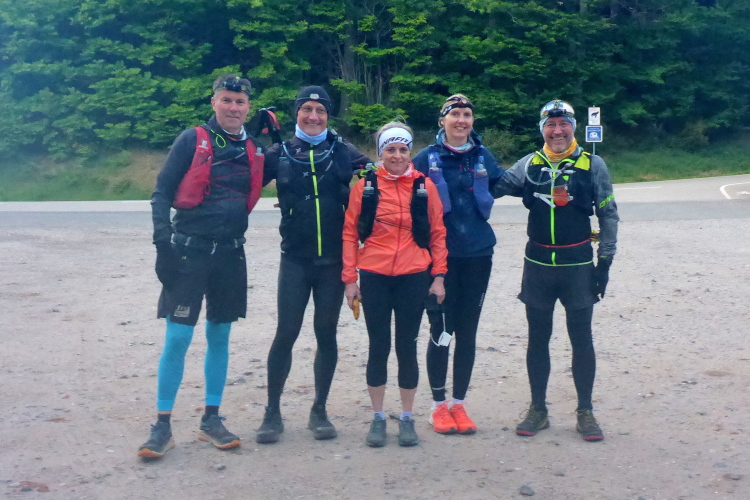 Doro, Astrid und ich fahren mit Jenny, die uns mit Uli während der geplanten 20 Stunden supporten wird. Stefan wartet schon auf uns am verabredeten Parkplatz an der Haut Koenigsbourg, wo im letzten Jahr die zweite Etappe endete. Er trägt Handschuhe und Wintermütze, was uns nicht überrascht, als wir aussteigen. Es ist lausig kalt und ein eisiger Wind bläst uns um die Nase. Fünf Minuten später kommt Hans Werner an. Seine Frau Uli fährt den Food-Truck mit unserer Verpflegung. Schnell machen wir uns fertig. Noch ein Abschiedsfoto und schon geht es los. Die Spätstarter werden uns neunzig Minuten später folgen.