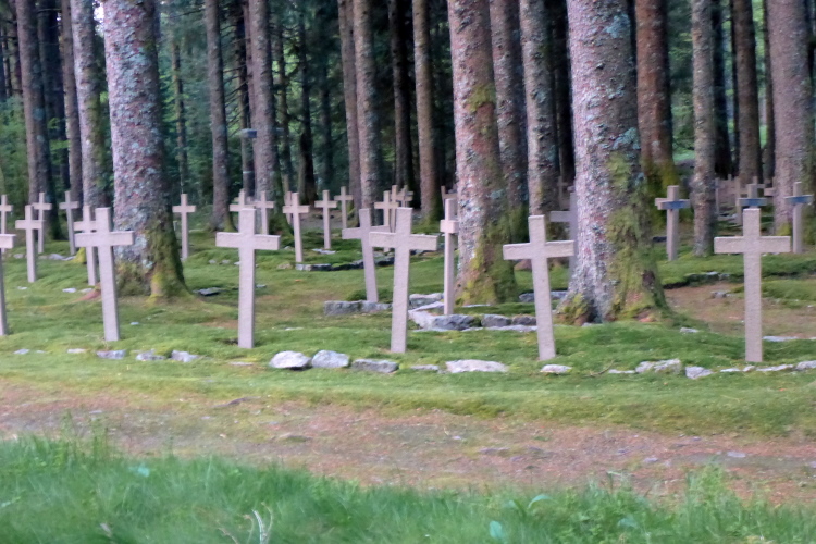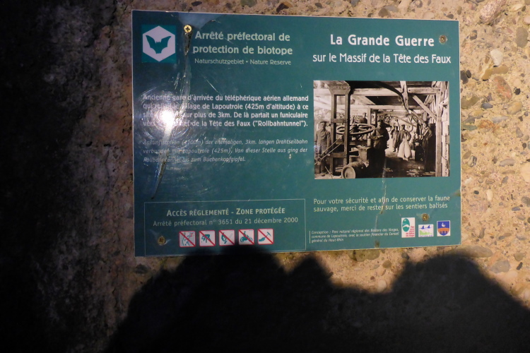 Wenn es lange runter geht, geht es auch wieder lange hoch. Wir sind im Aufstieg zur Tête des Faux. Im ersten Weltkrieg war der Gipfel aufgrund seiner exponierten Lage heiß umkämpft. Der Untergrund ist ab jetzt sehr felsig und die Wege bestehen nur noch aus grobem Blockwerk. Wir passieren eine imposante Geschützstellung und einen großen Bunker. Im Gipfelbereich erkennt man noch viele Unterstände und Reste der Schützengräben und Wehranlagen. Die Dämmerung bricht heran und gibt dem Ganzen eine seltsame Stimmung. Bis die Sonne erscheint dauert es aber noch eine Weile. Stefan und Hans Werner sind durch. Die Kälte und die technisch anspruchsvolle Strecke haben sie zermürbt. An einem Soldatenfriedhof trennen wir uns. Für mich und Astrid wird es einfach zu kalt, wenn wir auf die beiden warten müssen.