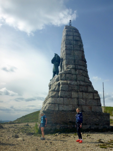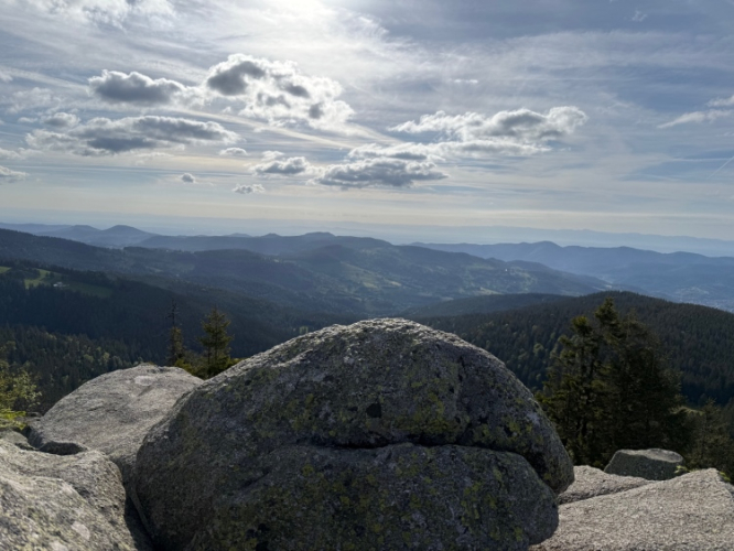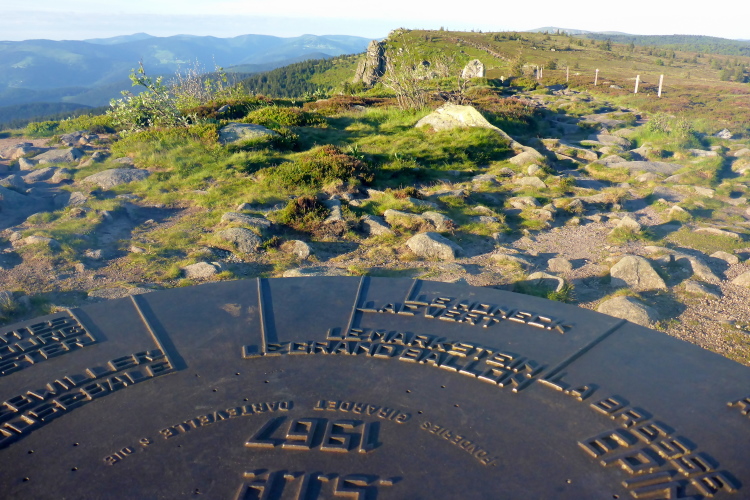 Etwa eine Stunde vor der geplanten Zeit, erreichen wir unser Ziel, das Monument zu Ehren der Diables Bleus (die Blauen Teufel, ein Gebirgsjägerbataillon). Wir genießen den fantastischen Ausblick in die Rheinebene und zu unserem nächsten Ziel, Belfort im Jura. Dazwischen liegt noch das Elsässer Bellchen. Von dort sieht man übrigens am ersten Mai, dem Feiertag Beltane des keltischen Gottes Belenus, die Sonne über dem Grand Ballon aufgehen.