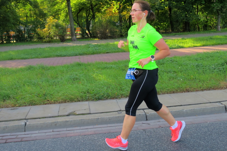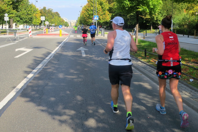 Ein Veteran hat es auf mich abgesehen. Er ist kaum schneller als ich, überholt mich und hatscht nach 100 m wieder. Rücke ich auf, legt er wieder los. Das geht einige Zeit, bis wir bei Kilometer 12 gegenüber dem für die Fußball-Europameisterschaft 2012 erbauten Stadion Narodowy nun Gegenverkehr bekommen. Bei Kilometer 13 ist der Spuk vorbei, der Veteran ist zurückgefallen, die meisten der Nachkommenden, die ich eben fotografiert habe, haben mich bis zum Anstieg auf die im Jahre 2000 eröffnete, 479 m lange Most Świętokrzyski, die wir nun am Wege zurück in die Stadt überqueren, überholt.