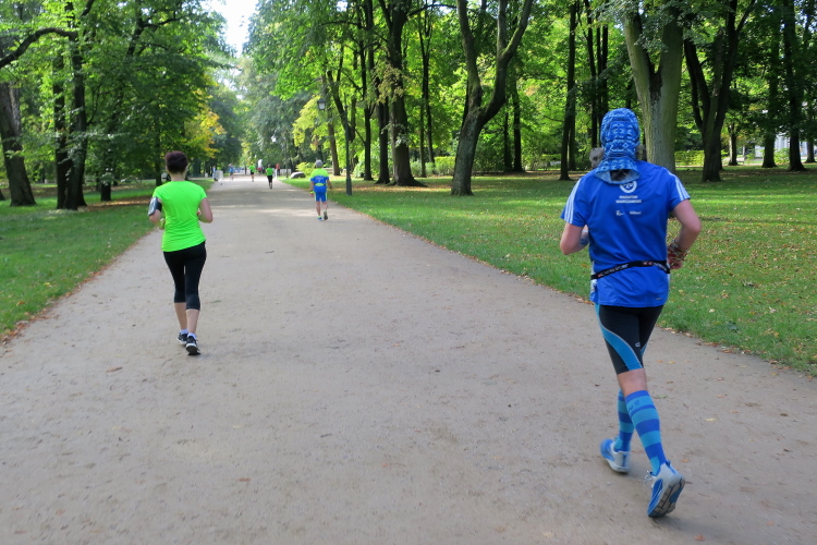 Am Ausgang des Parks stehen zwei aus der Truppe der als Legionäre verkleideten Läufer, es scheint, dass sie auf den Start des Halbmarathons warten. 19 km sind erreicht, der Kurs wendet nun wieder und führt nach Norden. Es ist ein langer Weg mit einigen Steigungen, die Halbmarathondistanz wird in der Stare miasto erreicht.