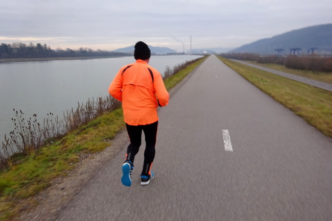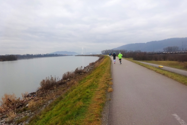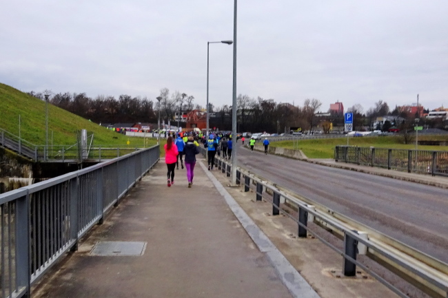Das Feld der Halbmarathonläufer und der 8 km-Starter ist lang auseinander gezogen. Aber es gibt auch Langsame, die mich nicht zu überlaufen vermögen – der Halbmarathon ist 3 h offen. Auf der im Laufrichtung gesehen rechten Seite ist die riesige Kia-Autoproduktionsstätte mit freiem Auge gut erkennbar – ein ebenso vielgleisiger Verschiebebahnhof komplettiert die Industriezone rechts vom Damm.