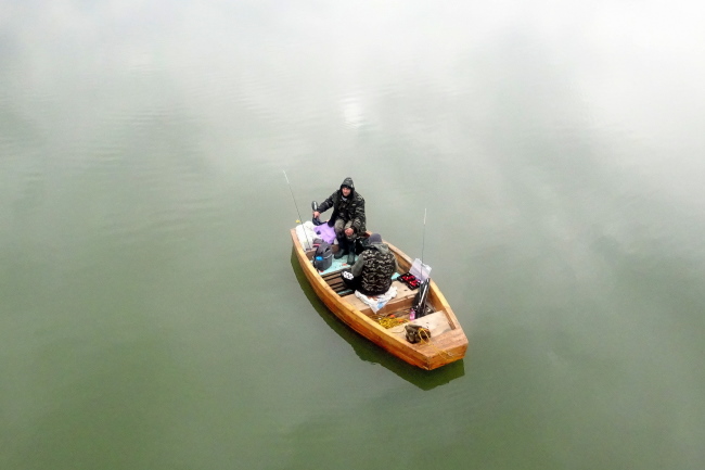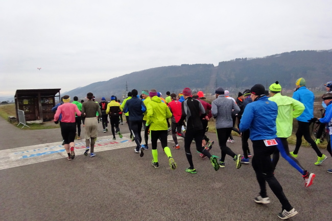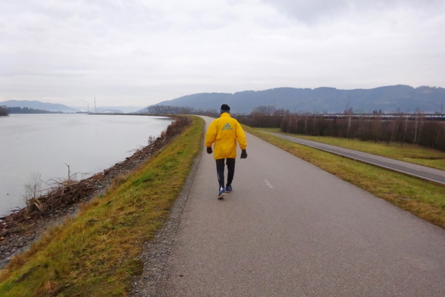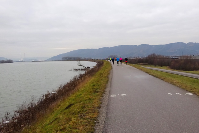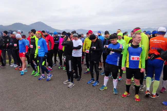 Ich begebe mich mit Josef zum Start an die von der Zufahrtsstraße aus gesehen linke Seite des Dammes. Der Asphalt beim Anstieg ist vereist, hier müssen wir beim Herunterlaufen aufpassen, das war auch letztes Jahr so. Aber ein Winterwetter ohne Schnee ist heuer für den Marathon vorteilhaft, dazu ist es fast windstill.