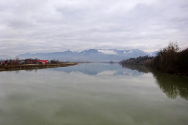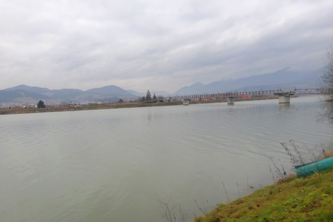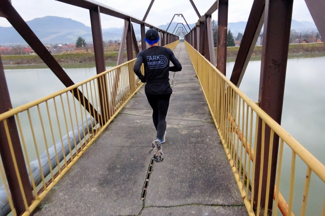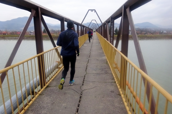 Damit der Rundkurs eingehalten werden kann, müssen wir nach ca. 4 km über die kleine Brücke ans andere Ufer laufen. Hier liegt in der Nähe des Damms die Ortschaft Mojš, die zum Kommunalverband von Žilina gehört. Ich erinnere mich an letztes Jahr – als die Halbmarathonläufer nachstürmten und mit mir dutzendfach über die Brücke liefen, geriet diese ins beängstigendes Schwingen – aber bisher hielt sie bei all den 15 Marathons stand. Nach der Brücke geht es wieder nach Westen. Der aufgestaute Fluss Waag fliest von Ost nach West, die Topologie lässt aber einen Anstieg auf der nun rechten Seite des Kurses erkennen, sodass die nun folgenden 4 km mit leichtem Westwind immer etwas länger dauern. Mein zweiter Durchlauf erfolgt nach 59 Minuten – das entspricht einer Laufzeit von ca. 6:30/km für nunmehr erreichte 9 km.