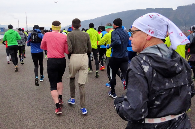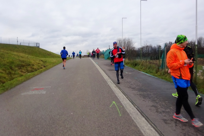 Nach 10 km werden ich das erste Mal von den Führenden beim Marathon überlaufen. Sonst ist auf der Strecke nichts los, ab und zu kommt mir ein Spaziergänger entgegen. Aber als ich in die Nähe der Zeitnehmung komme, sind dort Hunderte Halbmarathonläufer versammelt und bereiten sich auf ihren Start vor. Ich beende meine zweite Runde nach 17,3 km mit einer Durchgangszeit von 1:53 h und habe etwas aufgeholt.