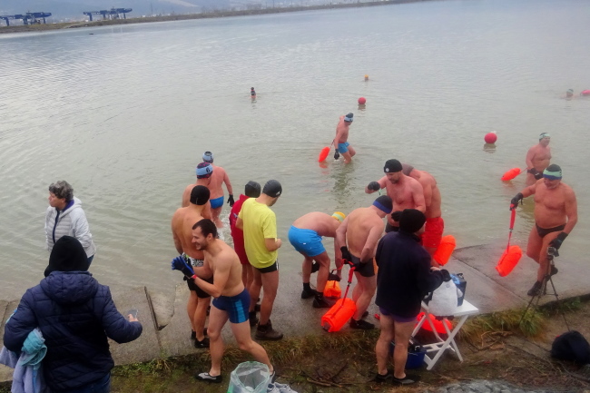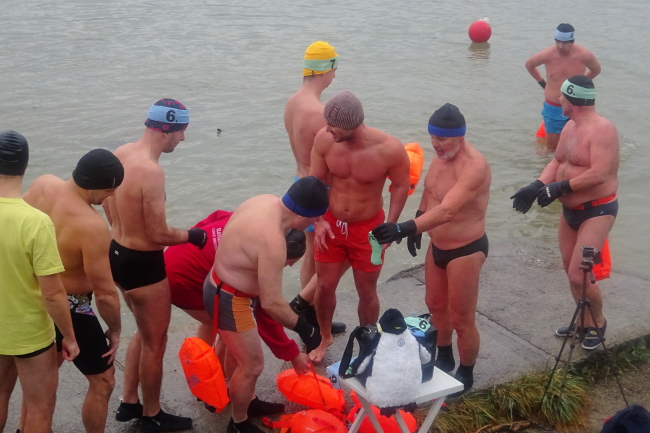 Das Spektakel aber sind nicht die Finisher, sondern unter dem Beifall vieler warm angezogener Zuschauer rund zwei Dutzend Schwimmer, die alle von einem Klub kommen und richtige „Restln“ sind – wie wir in Wien sagen, teilweise muskelbepackt vom Schwimmtraining, aber auch mit einer dicken Fettschicht ummantelt. Ich kann mir keinen längeren Stopp als 2 Minuten für Fotos und einen Becher Tee leisten, um nicht in Verzug zu kommen. Da es schon kurz vor 12 Uhr 30 ist, dürfte meines Erachtens der Bewerb schon zu Ende sein, die Schwimmer machen Anstalten, aus dem Wasser ans Ufer zu kommen.