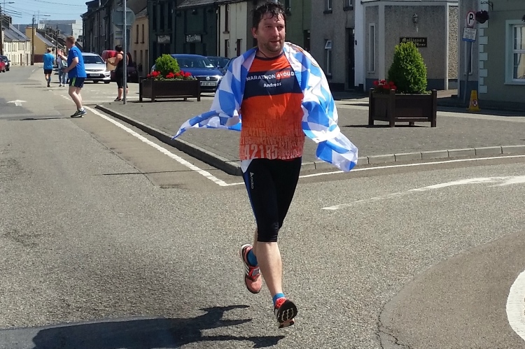 Wir haben Murntown erreicht und ich schließe auf Dinny Johnston auf. Er hat wohl eine private Verpflegungsstation, denn aus einem Kofferraum bekommt er ein Schinken-Käse-Sandwich gereicht. Wie selbstverständlich fragt er mich, ob ich auch eine Ecke haben will und natürlich greife ich zu. Gemeinsam traben wir nun nebeneinander her und vertilgen gemeinsam das Sandwich. Die nächsten Kilometer teilen wir uns und unterhalten uns über Gott und die Welt. Dass wir in Deutschland auf den Autobahnen keine Geschwindigkeitsbegrenzungen haben, findet Dinny unglaublich.
