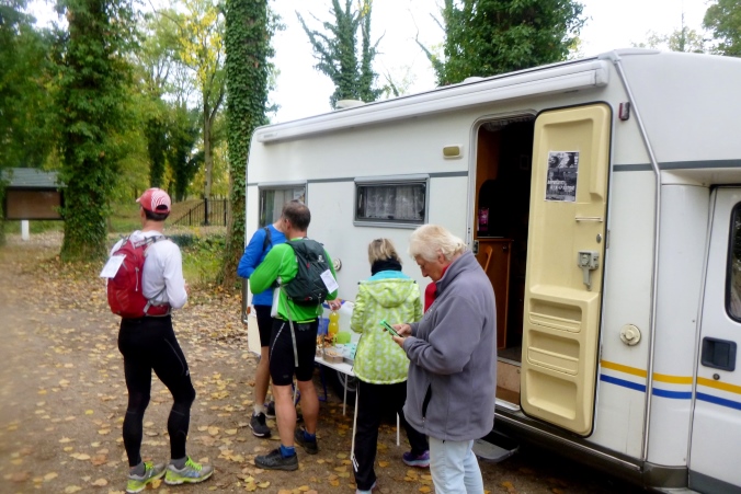 Das Laufen geht flott und bald sind wir an VP1. Annemarie, Willems Frau, sorgt für uns. Jeder bekommt seinen Trinkbecher, was Süßes oder Herzhaftes; dann weiter. Neben dem VP liegt die Ruine eines Kasteels, im Krieg vollkommen zerstört. Schlimme Erinnerungen, zumal ganz in der Nähe eine heftige Panzerschlacht tobte. Der schönen Landschaft ist das aber nicht mehr anzusehen.