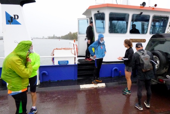 Boxmeer heißt der Startort, über Autobahnen gut zu erreichen. Alle treffen sich bei Willem zu Haus im Wohnzimmer. Richtig gemütlich. Die GPS-Geräte werden mit dem aktuellen Track bestückt; wer keines benutzt, hängt sich einfach an die elektronischen Pfadfinder dran, das klappt auch. Bei schönem Wetter (kalt und sonnig) starten wir. Durch die Wohnsiedlung laufen wir rüber zur Maas, schnell sind wir in den Feldern. Unser erstes Ziel ist die Maasfähre. Die fährt alle paar Minuten hin und her, hier im Land ist ja normaler Arbeitstag. Der Käptn bringt alle exklusiv rüber.