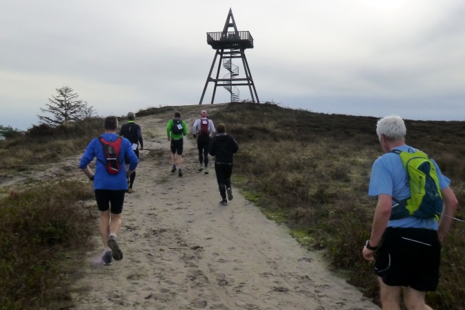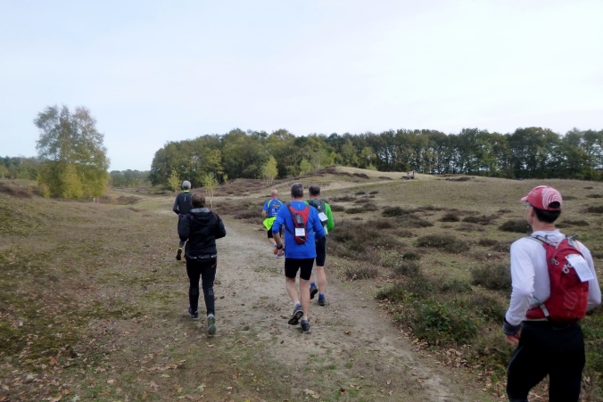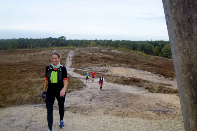Die Dünen rauf, Aussicht genießen und im Tiefsand steil wieder runtertoben, ein herrlicher Spaß! An den Seen vorüber, dann auf Trails im Zickzack durchs Gebüsch. Ein sehr schmaler Pfad schlängelt sich durchs Gelände, ist sogar auf den E-Karten zu sehen, verschwindet dann aber komplett im Heidekraut. Man sieht nichts. Nur mit den Füßen kann man sich vortasten. Da, wo nix wächst, geht’s weiter… Bis zum VP2. Annemarie verwöhnt uns dort mit heißer Nudelsuppe, einfach nur köstlich.
